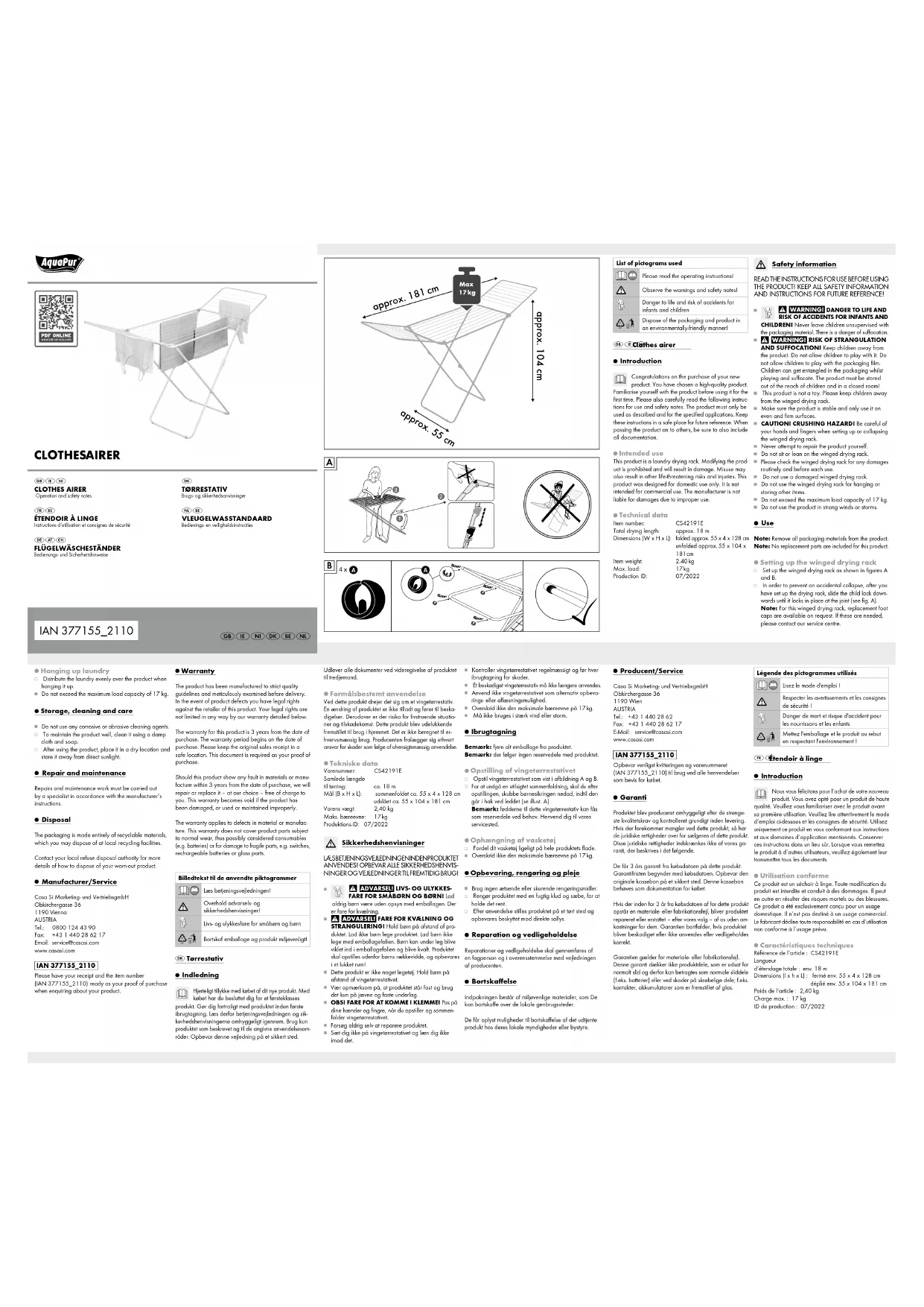 GU- LATION ET D‘ÉTOUFFEMENT ! Tenez les enfants à l‘écart du produit. Ne laissez pas les enfants jouer avec. Ne laissez pas les enfants jouer avec le film d‘emballage. Les enfants peuvent y être pris au piège et s‘étouffer en jouant avec. Le produit doit être conservé hors de portée des enfants et dans une pièce fermée ! Ceci n‘est pas un jouet. Veuillez tenir les enfants à l‘écart du sèche-linge à ailettes. Veillez à une bonne assise et utilisez le produit uniquement sur des sols plans et rigides. ATTENTION ! RISQUE D‘ÉCRASEMENT ! Faites attention à vos mains et à vos doigts lorsque vous dépliez ou repliez le sèche-linge à ailettes. N‘essayez jamais de réparer le produit vous-même. Ne vous asseyez pas et ne vous appuyez pas non plus sur le sèche-linge à ailettes. Veuillez contrôler régulièrement et avant chaque utilisation que le sèche-linge à ailettes n‘est pas endommagé. Un sèche-linge à ailettes détérioré ne doit plus être utilisé. N‘utilisez pas le sèche-linge à ailettes comme surface de dépose ou dispositif de rangement. Ne dépassez pas la capacité maximale de charge qui est de 17 kg. N’utilisez pas le produit en cas de vent fort ou de tempête. Utilisation Remarque: Veuillez retirer tous les emballages du produit. Remarque: Aucune pièce de rechange n‘est fournie pour ce produit. Mettre en place le sèche-linge à ailettes Mettez en place le sèche-linge à ailettes comme repré- senté sur les illustrations A et B. Après avoir mis en place le sèche-linge, et pour éviter qu‘il ne se replie de manière involontaire, glissez la sécurité enfant vers le bas jusqu‘à ce qu‘elle s‘enclenche dans la charnière (voir ill. A). Remarque : Des capuchons pour pieds sont dispo- nibles pour ce sèche-linge à ailettes en tant que pièces de rechange en cas de besoin. En cas de besoin, veuillez vous adresser à notre service après-vente. Étendre le linge Répartir le linge à étendre uniformément sur toute la surface. Ne dépassez pas la capacité maximale de charge qui est de 17 kg. Stockage, nettoyage et entretien Ne pas utiliser de produit nettoyant corrosif ou abrasif. Nettoyer le produit avec un chiffon humide avec du savon afin de le maintenir en bon état. Après utilisation, entreposer le produit dans un endroit sec et protégé des rayons directs du soleil. Réparation et maintenance Les réparations et travaux de maintenance doivent être effectués par une personne spécialisée et dans le respect des instructions fournies par le fabricant. Mise au rebut L’emballage se compose de matières recyclables pouvant être mises au rebut dans les déchetteries locales. Votre mairie ou votre municipalité vous renseigneront sur les possibilités de mise au rebut des produits usagés. IAN 377155_2110 Houd bij alle vragen alstublieft de kassabon en het arti kel- nummer (IAN 377155_2110) als bewijs van aankoop bij de hand. Garantie Het product wordt volgens strenge kwaliteitsrichtlijnen zorg- vuldig geproduceerd en voor levering grondig getest. In ge- val van schade aan het product kunt u rechtmatig beroep doen op de verkoper van het product. Deze wettelijke rechten worden door onze hierna vermelde garantie niet beperkt. Op dit product verlenen wij 3 jaar garantie vanaf aan- koopdatum. De garantieperiode start op de dag van aankoop. Bewaar de originele kassabon alstublieft. Dit document is nodig als bewijs voor aankoop. Wanneer binnen 3 jaar na de aankoopdatum van dit product een materiaal- of productiefout optreedt, dan wordt het product door ons – naar onze keuze – gratis voor u gerepareerd of vervangen. Deze garantie komt te vervallen als het product beschadigd wordt, niet correct gebruikt of onderhouden wordt. De garantie geldt voor materiaal- en productiefouten. Deze garantie is niet van toepassing op productonder- delen, die onderhevig zijn aan normale slijtage en hier- door als aan slijtage onderhevige onderdelen gelden (bijv. batterijen) of voor beschadigingen aan breekbare onderdelen, zoals bijv. schakelaars, accu’s of dergelijke onderdelen, die gemaakt zijn van glas. Legende der verwendeten Piktogramme Bedienungsanleitung lesen! Warn- und Sicherheitshinweise beachten! Lebens- und Unfallgefahr für Kleinkinder und Kinder