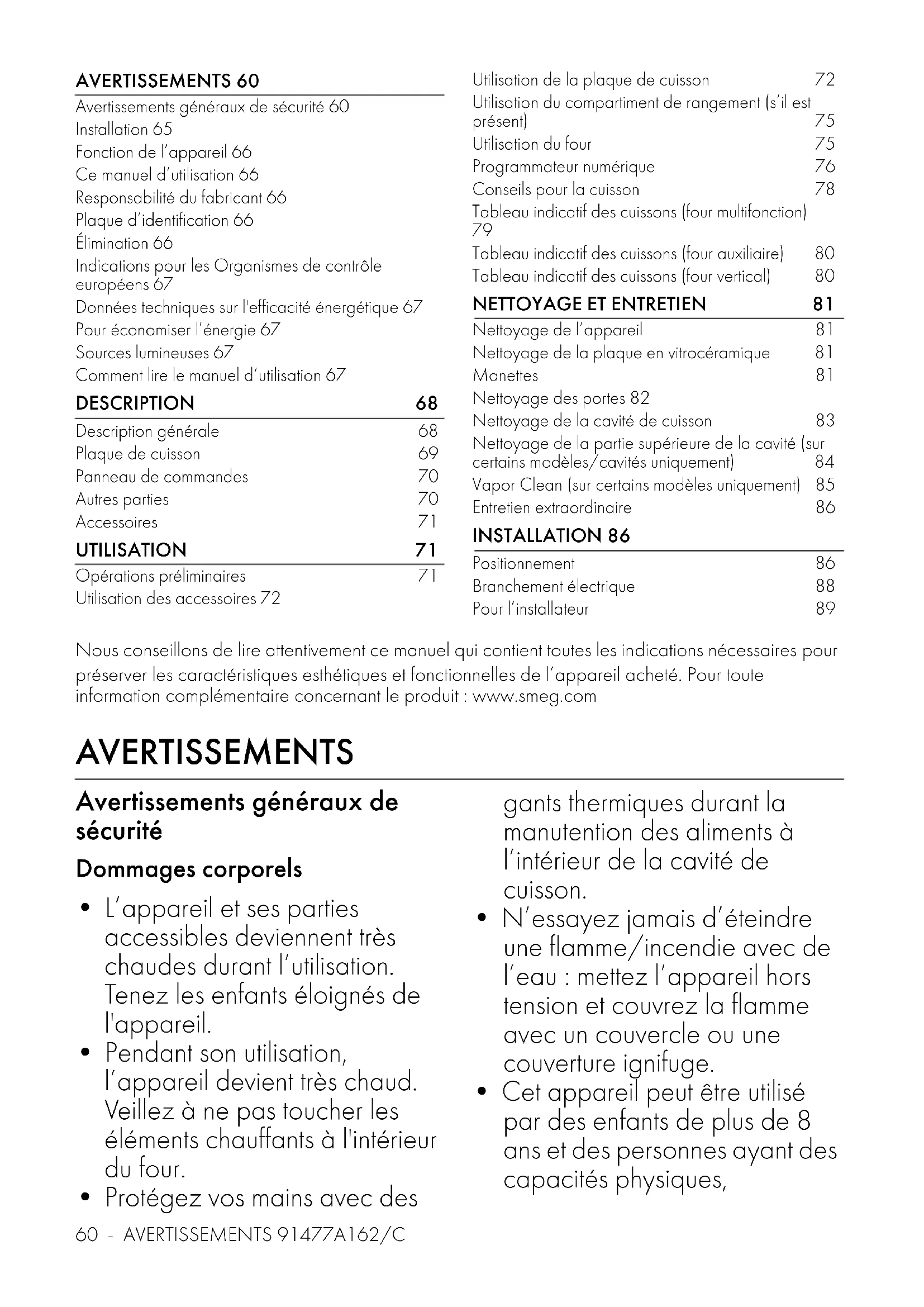 Nettoyage de l’appareil 81 Nettoyage de la plaque en vitrocéramique 81 Manettes 81 Nettoyage des portes 82 Nettoyage de la cavité de cuisson 83 Nettoyage de la partie supérieure de la cavité (sur certains modèles/cavités uniquement) 84 Vapor Clean (sur certains modèles uniquement) 85 Entretien extraordinaire 86 INSTALLATION 86 Positionnement 86 Branchement électrique 88 Pour l’installateur 89 Nous conseillons de lire attentivement ce manuel qui contient toutes les indications nécessaires pour préserver les caractéristiques esthétiques et fonctionnelles de l’appareil acheté. Pour toute information complémentaire concernant le produit : www.smeg.com AVERTISSEMENTS Avertissements généraux de sécurité Dommages corporels