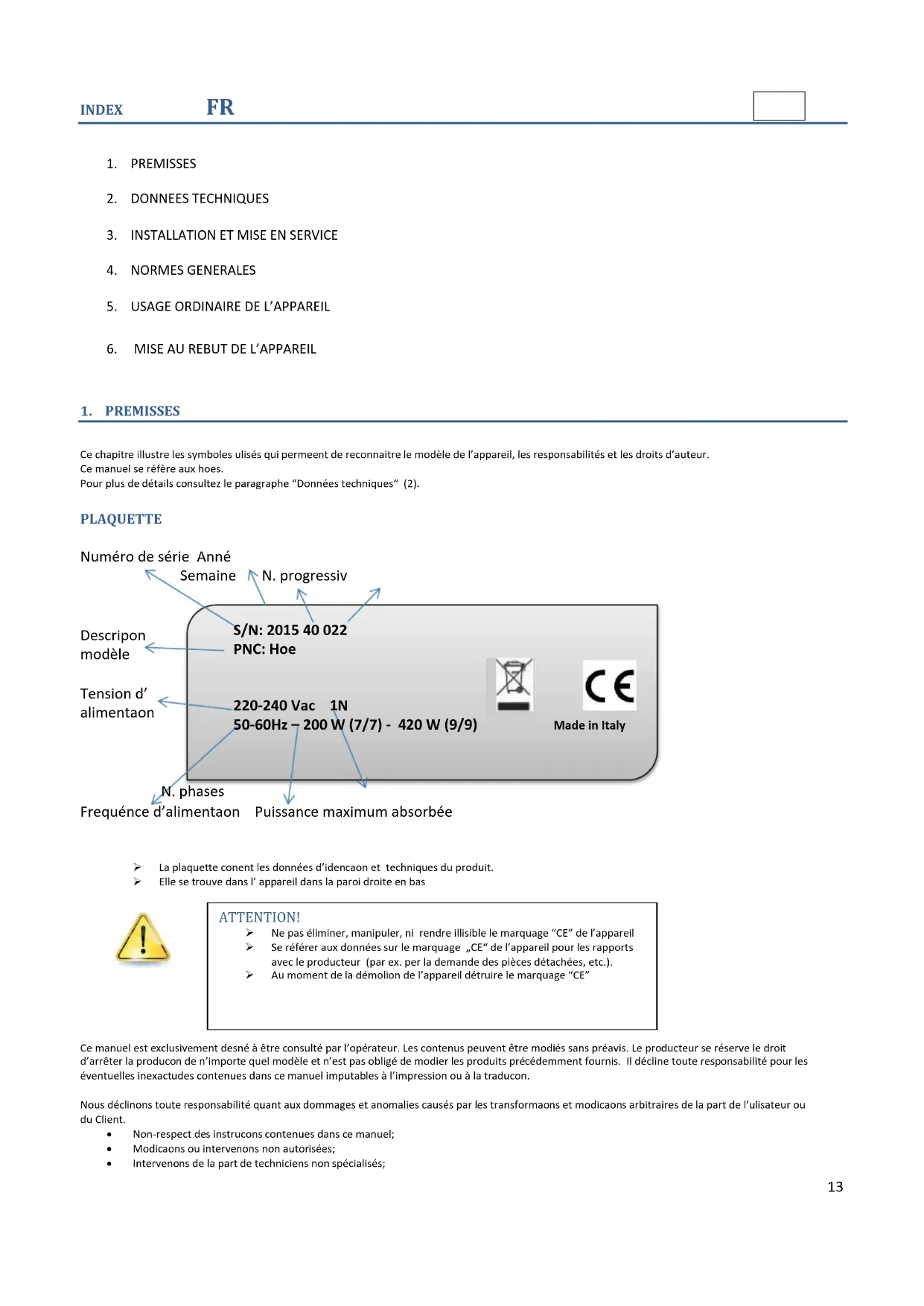 Ce manuel est exclusivement destiné à être consulté par l’opérateur. Les contenus peuvent être modifiés sans préavis. Le producteur se réserve le droit d’arrêter la production de n’importe quel modèle et n’est pas obligé de modifier les produits précédemment fournis. Il décline toute responsabilité pour les éventuelles inexactitudes contenues dans ce manuel imputables à l’impression ou à la traduction. Nous déclinons toute responsabilité quant aux dommages et anomalies causés par les transformations et modifications arbitraires de la part de l’utilisateur ou du Client. Non-respect des instructions contenues dans ce manuel; Modifications ou interventions non autorisées; Interventions de la part de techniciens non spécialisés; S/N: 2015 40 022 PNC: Hotte 220-240 Vac 1N 50-60Hz – 200 W (7/7) - 420 W (9/9) Made in Italy ATTENTION! Ne pas éliminer, manipuler, ni rendre illisible le marquage “CE” de l’appareil Se référer aux données sur le marquage „CE“ de l’appareil pour les rapports avec le producteur (par ex. per la demande des pièces détachées, etc.). Au moment de la démolition de l’appareil détruire le marquage “CE”14