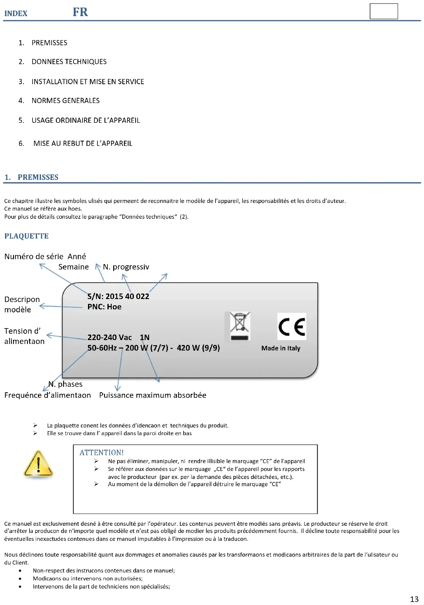 Ce chapitre illustre les symboles utilisés qui permettent de reconnaitre le modèle de l’appareil, les responsabilités et les droits d’auteur. Ce manuel se réfère aux hottes. Pour plus de détails consultez le paragraphe “Données techniques“ (2). PLAQUETTE Numéro de série Anné Semaine N. progressiv