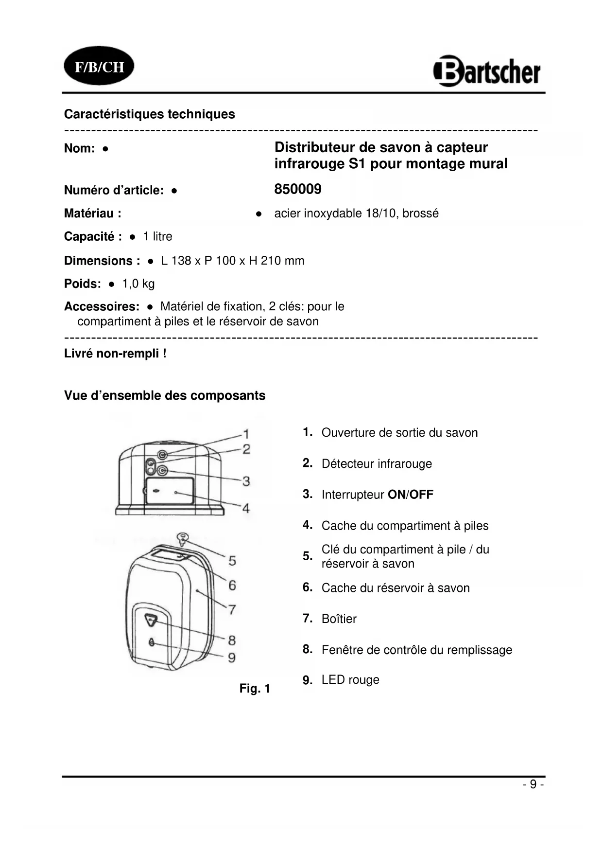 850009 - Distributeur de savon BARTSCHER - Notice d'utilisation et mode d'emploi gratuit