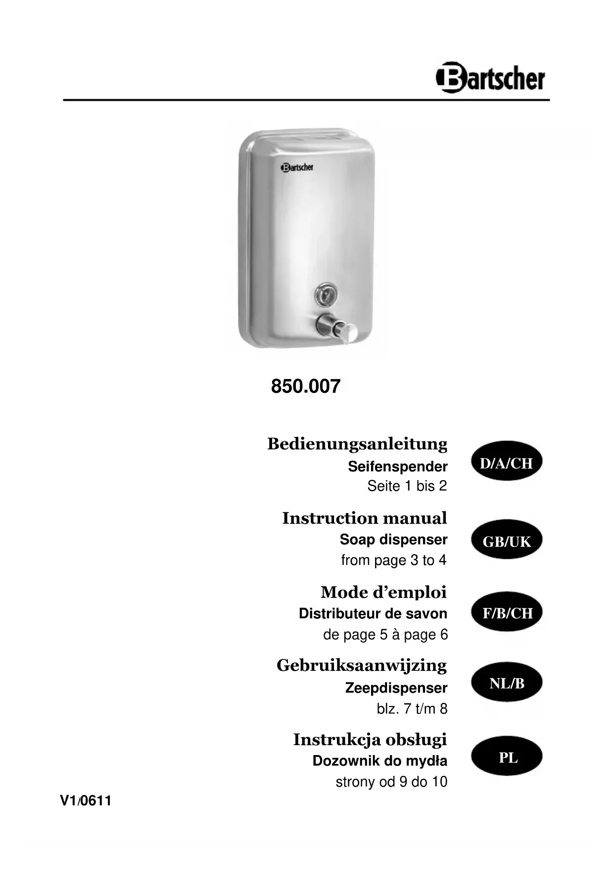 850007 - Distributeur de savon BARTSCHER - Notice d'utilisation et mode d'emploi gratuit