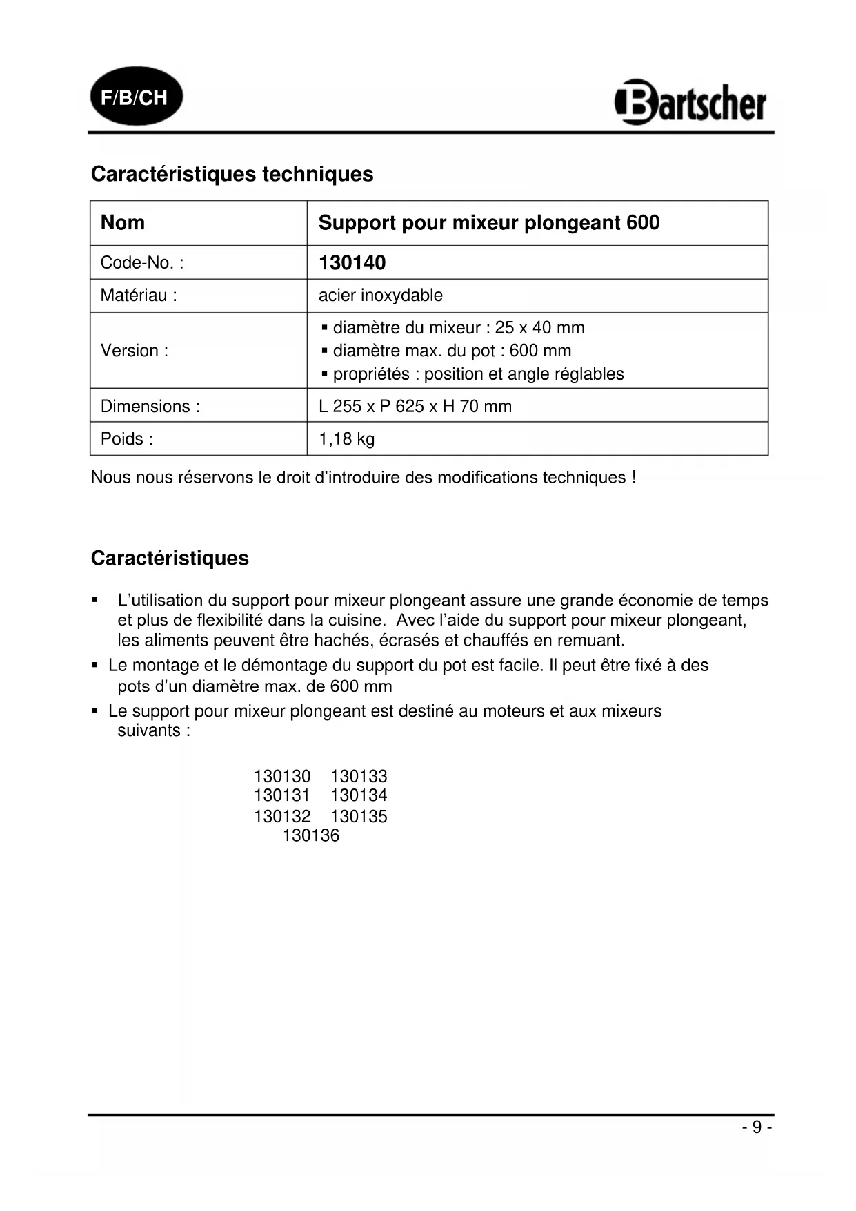 130140 - Mixeur plongeant BARTSCHER - Notice d'utilisation et mode d'emploi gratuit