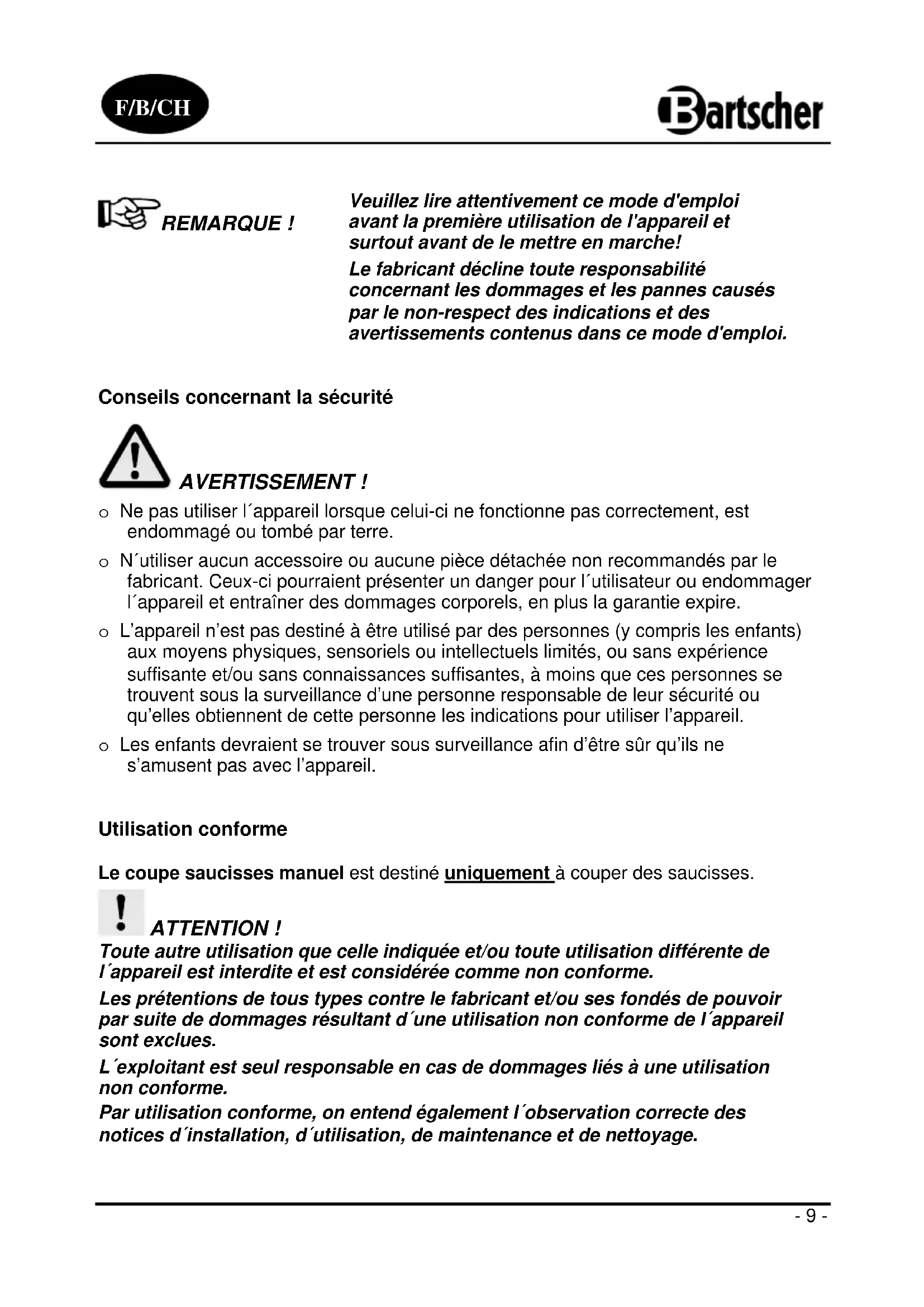 Bartscher GmbH Franz-Kleine-Str. 28 D-33154 Salzkotten phone: +49 (0) 5258 971-0 Germany fax: +49 (0) 5258 971-120- 9 - REMARQUE ! Veuillez lire attentivement ce mode d'emploi avant la première utilisation de l'appareil et surtout avant de le mettre en marche! Le fabricant décline toute responsabilité concernant les dommages et les pannes causés par le non-respect des indications et des avertissements contenus dans ce mode d'emploi.