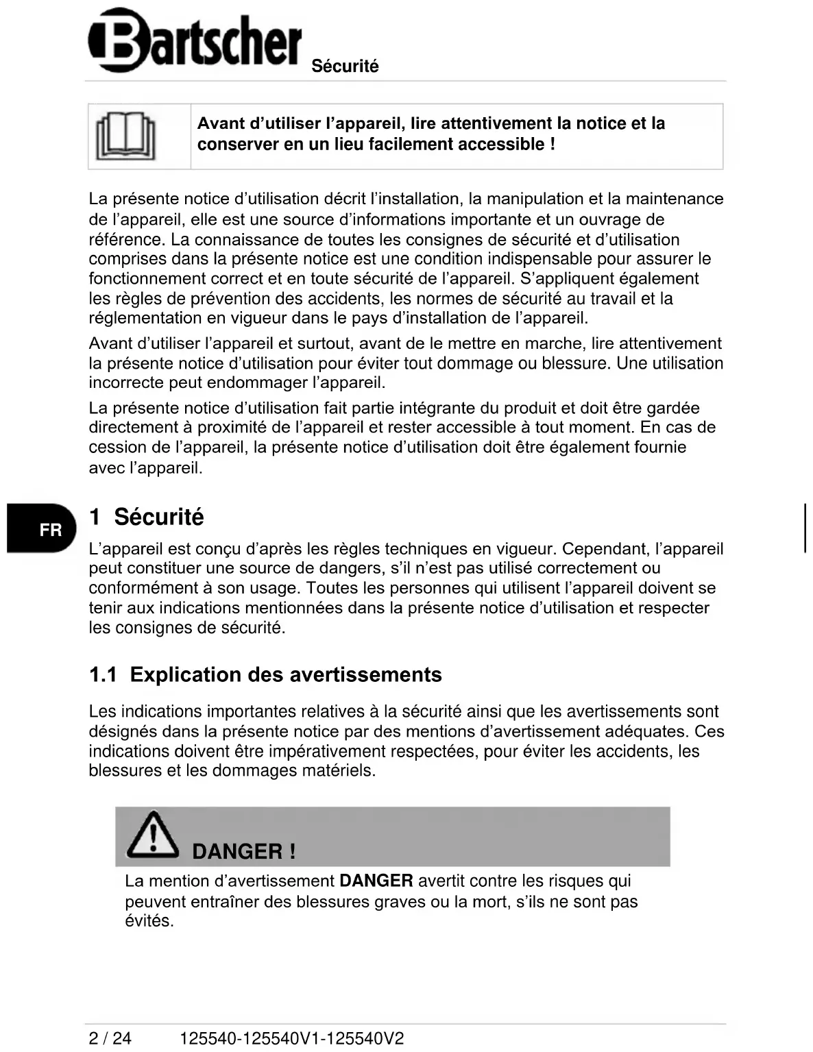 DANGER ! La mention d’avertissement DANGER avertit contre les risques qui peuvent entraîner des blessures graves ou la mort, s’ils ne sont pas évités.Sécurité 125540-125540V1-125540V2 3 / 24