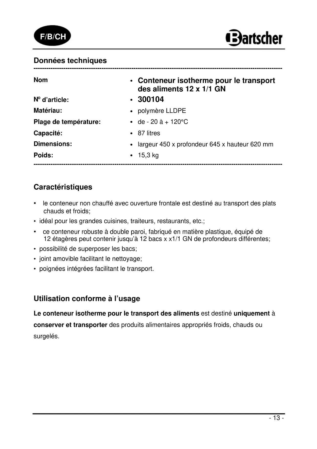 300104 - Récipient à nourriture BARTSCHER - Notice d'utilisation et mode d'emploi gratuit
