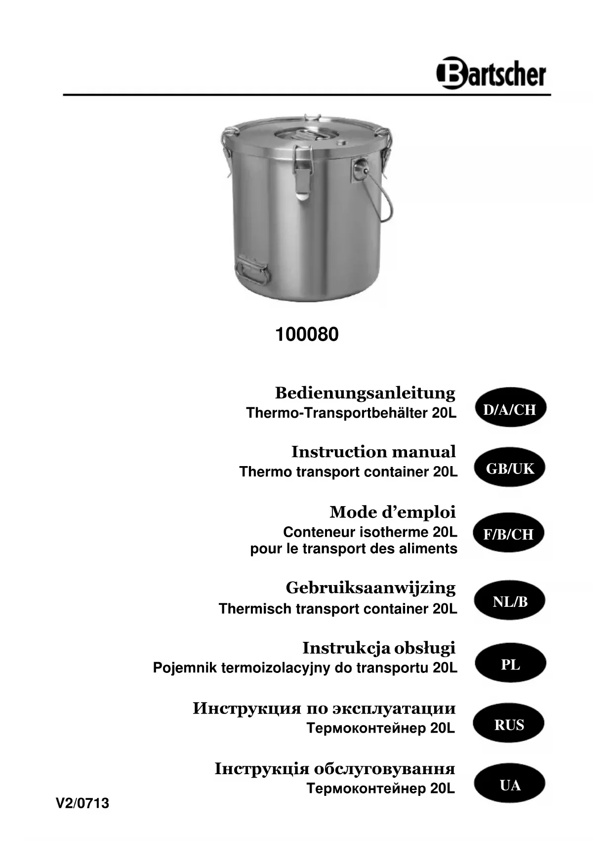 100080 - Récipient à nourriture BARTSCHER - Notice d'utilisation et mode d'emploi gratuit