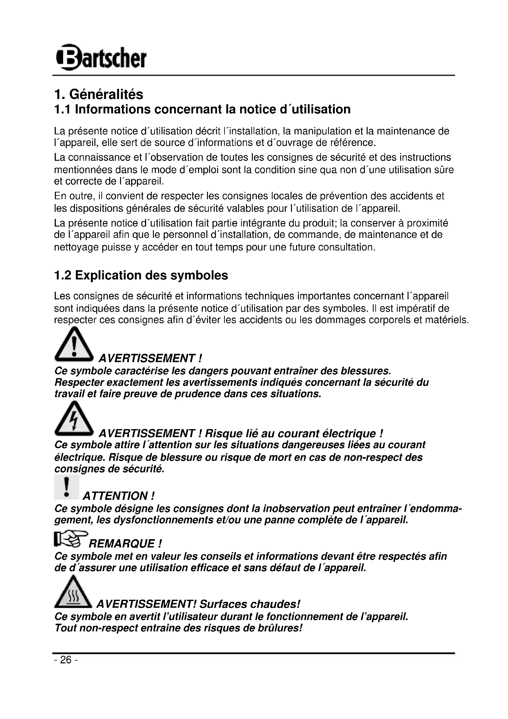 Les consignes de sécurité et informations techniques importantes concernant l´appareil sont indiquées dans la présente notice d´utilisation par des symboles. Il est impératif de respecter ces consignes afin d´éviter les accidents ou les dommages corporels et matériels. AVERTISSEMENT ! Ce symbole caractérise les dangers pouvant entraîner des blessures. Respecter exactement les avertissements indiqués concernant la sécurité du travail et faire preuve de prudence dans ces situations. AVERTISSEMENT ! Risque lié au courant électrique ! Ce symbole attire l´attention sur les situations dangereuses liées au courant électrique. Risque de blessure ou risque de mort en cas de non-respect des consignes de sécurité. ATTENTION ! Ce symbole désigne les consignes dont la inobservation peut entraîner l´endomma- gement, les dysfonctionnements et/ou une panne complète de l´appareil. REMARQUE ! Ce symbole met en valeur les conseils et informations devant être respectés afin de d´assurer une utilisation efficace et sans défaut de l´appareil. AVERTISSEMENT! Surfaces chaudes! Ce symbole en avertit l’utilisateur durant le fonctionnement de l’appareil. Tout non-respect entraine des risques de brûlures!- 27 -