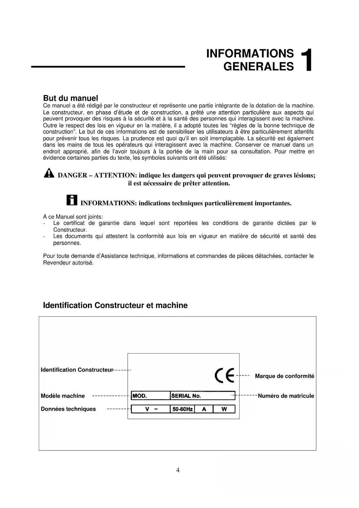 But du manuel Ce manuel a été rédigé par le constructeur et représente une partie intégrante de la dotation de la machine. Le constructeur, en phase d’étude et de construction, a prêté une attention particulière aux aspects qui peuvent provoquer des risques à la sécurité et à la santé des personnes qui interagissent avec la machine. Outre le respect des lois en vigueur en la matière, il a adopté toutes les “règles de la bonne technique de construction”. Le but de ces informations est de sensibiliser les utilisateurs à être particulièrement attentifs pour prévenir tous les risques. La prudence est quoi qu’il en soit irremplaçable. La sécurité est également dans les mains de tous les opérateurs qui interagissent avec la machine. Conserver ce manuel dans un endroit approprié, afin de l’avoir toujours à la portée de la main pour sa consultation. Pour mettre en évidence certaines parties du texte, les symboles suivants ont été utilisés: DANGER – ATTENTION: indique les dangers qui peuvent provoquer de graves lésions; il est nécessaire de prêter attention. INFORMATIONS: indications techniques particulièrement importantes. A ce Manuel sont joints: - Le certificat de garantie dans lequel sont reportées les conditions de garantie dictées par le Constructeur. - Les documents qui attestent la conformité aux lois en vigueur en matière de sécurité et santé des personnes. Pour toute demande d’Assistance technique, informations et commandes de pièces détachées, contacter le Revendeur autorisé. Identification Constructeur et machine Identification Constructeur Modèle machine Données techniques Marque de conformité Numéro de matricule5 INFORMATIONS GENERALES