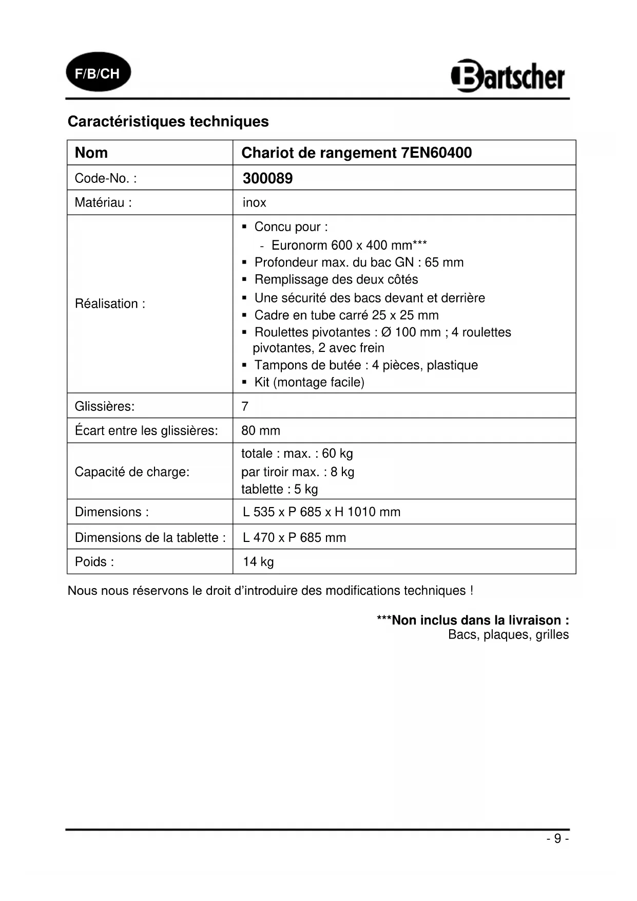 Écart entre les glissières: 80 mm Capacité de charge: totale : max. : 60 kg par tiroir max. : 8 kg tablette : 5 kg Dimensions : L 535 x P 685 x H 1010 mm Dimensions de la tablette : L 470 x P 685 mm Poids : 14 kg Nous nous réservons le droit d’introduire des modifications techniques ! ***Non inclus dans la livraison : Bacs, plaques, grilles F/B/CH- 10 - Pièces fournies (fig. 1 + 2)