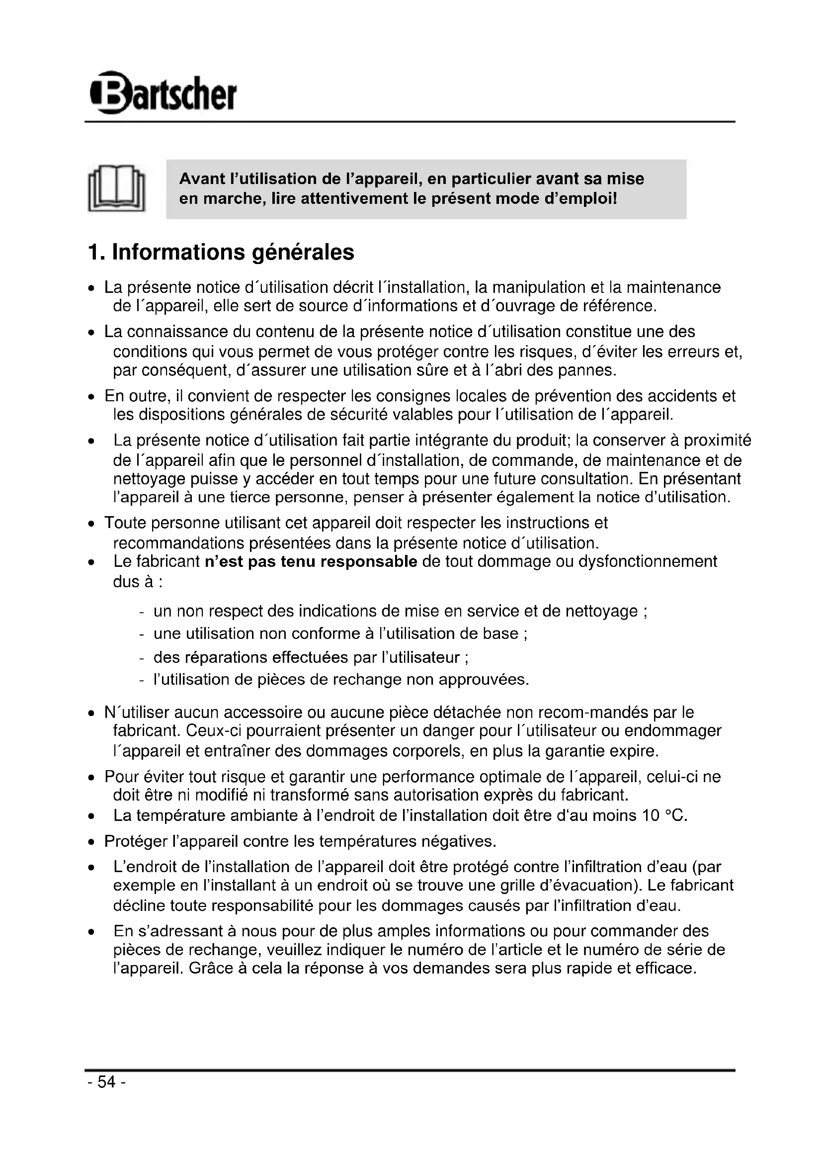 La présente notice d´utilisation décrit l´installation, la manipulation et la maintenance de l´appareil, elle sert de source d´informations et d´ouvrage de référence. La connaissance du contenu de la présente notice d´utilisation constitue une des conditions qui vous permet de vous protéger contre les risques, d´éviter les erreurs et, par conséquent, d´assurer une utilisation sûre et à l´abri des pannes. En outre, il convient de respecter les consignes locales de prévention des accidents et les dispositions générales de sécurité valables pour l´utilisation de l´appareil. La présente notice d´utilisation fait partie intégrante du produit; la conserver à proximité de l´appareil afin que le personnel d´installation, de commande, de maintenance et de nettoyage puisse y accéder en tout temps pour une future consultation. En présentant l’appareil à une tierce personne, penser à présenter également la notice d’utilisation. Toute personne utilisant cet appareil doit respecter les instructions et recommandations présentées dans la présente notice d´utilisation. Le fabricant n’est pas tenu responsable de tout dommage ou dysfonctionnement dus à : - un non respect des indications de mise en service et de nettoyage ; - une utilisation non conforme à l’utilisation de base ; - des réparations effectuées par l’utilisateur ; - l’utilisation de pièces de rechange non approuvées. N´utiliser aucun accessoire ou aucune pièce détachée non recom-mandés par le fabricant. Ceux-ci pourraient présenter un danger pour l´utilisateur ou endommager l´appareil et entraîner des dommages corporels, en plus la garantie expire. Pour éviter tout risque et garantir une performance optimale de l´appareil, celui-ci ne doit être ni modifié ni transformé sans autorisation exprès du fabricant. La température ambiante à l’endroit de l’installation doit être d‘au moins 10 °C. Protéger l’appareil contre les températures négatives. L’endroit de l’installation de l’appareil doit être protégé contre l’infiltration d’eau (par exemple en l’installant à un endroit où se trouve une grille d’évacuation). Le fabricant décline toute responsabilité pour les dommages causés par l’infiltration d’eau. En s’adressant à nous pour de plus amples informations ou pour commander des pièces de rechange, veuillez indiquer le numéro de l’article et le numéro de série de l’appareil. Grâce à cela la réponse à vos demandes sera plus rapide et efficace.- 55 -