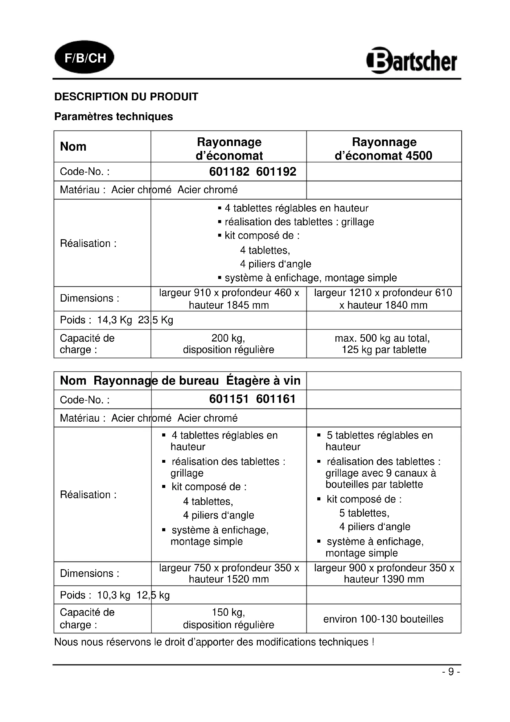 Matériau : Acier chromé Acier chromé Réalisation : 4 tablettes réglables en hauteur réalisation des tablettes : grillage kit composé de : 4 tablettes, 4 piliers d‘angle système à enfichage, montage simple 5 tablettes réglables en hauteur réalisation des tablettes : grillage avec 9 canaux à bouteilles par tablette kit composé de : 5 tablettes, 4 piliers d‘angle système à enfichage, montage simple Dimensions : largeur 750 x profondeur 350 x hauteur 1520 mm largeur 900 x profondeur 350 x hauteur 1390 mm Poids : 10,3 kg 12,5 kg Capacité de charge : 150 kg, disposition régulière environ 100-130 bouteilles Nous nous réservons le droit d’apporter des modifications techniques ! F/B/CH- 10 - Liste des pièces / éléments fournis