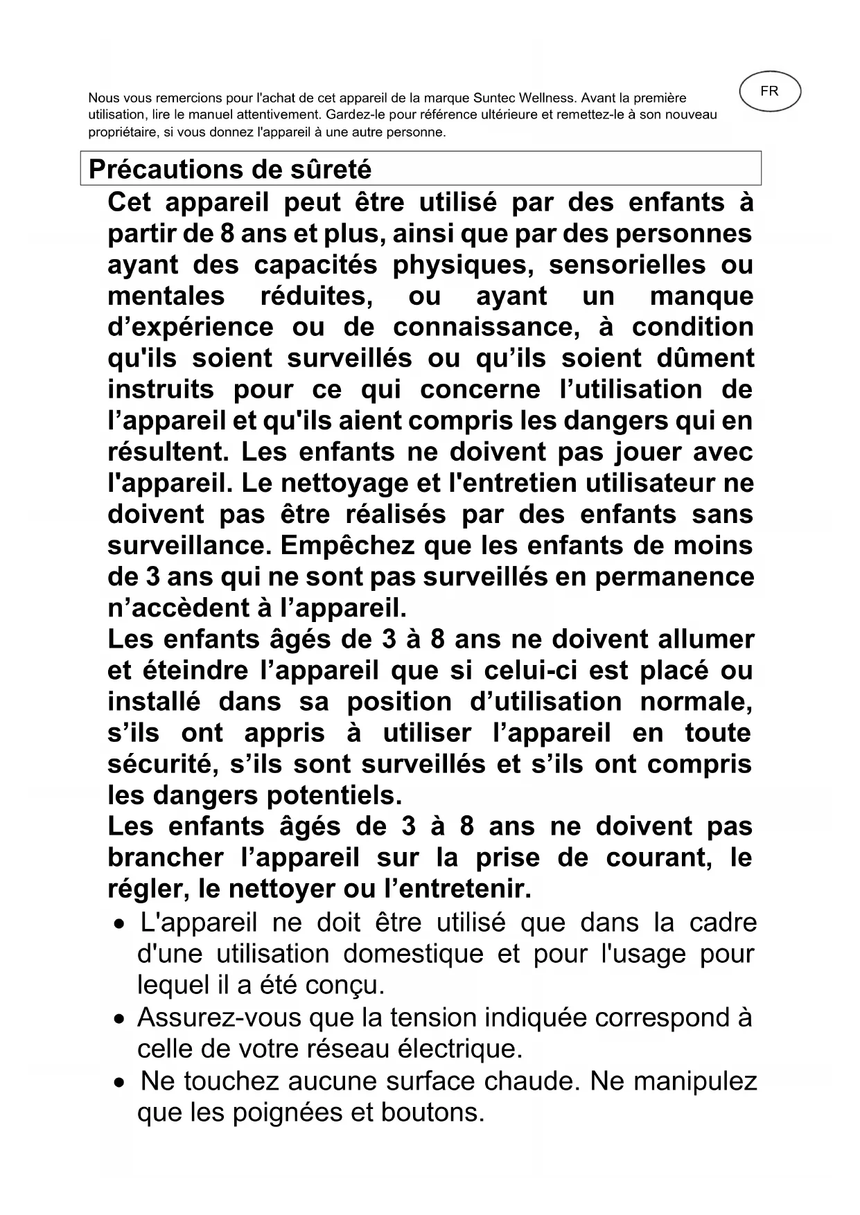 © 2022 Suntec Wellness® RAC-8151 Flex8 metal/metal, RAC-8069 Flex8 metal/stone, RAC-7079 Flex8 stone/stone SUNTEC WELLNESS GMBH / HOLZSTRASSE 2 / 40 221 DÜSSELDORF / GERMANIAFR Nous vous remercions pour l'achat de cet appareil de la marque Suntec Wellness. Avant la première utilisation, lire le manuel attentivement. Gardez-le pour référence ultérieure et remettez-le à son nouveau propriétaire, si vous donnez l'appareil à une autre personne. Précautions de sûreté Cet appareil peut être utilisé par des enfants à partir de 8 ans et plus, ainsi que par des personnes ayant des capacités physiques, sensorielles ou mentales réduites, ou ayant un manque d’expérience ou de connaissance, à condition qu'ils soient surveillés ou qu’ils soient dûment instruits pour ce qui concerne l’utilisation de l’appareil et qu'ils aient compris les dangers qui en résultent. Les enfants ne doivent pas jouer avec l'appareil. Le nettoyage et l'entretien utilisateur ne doivent pas être réalisés par des enfants sans surveillance. Empêchez que les enfants de moins de 3 ans qui ne sont pas surveillés en permanence n’accèdent à l’appareil. Les enfants âgés de 3 à 8 ans ne doivent allumer et éteindre l’appareil que si celui-ci est placé ou installé dans sa position d’utilisation normale, s’ils ont appris à utiliser l’appareil en toute sécurité, s’ils sont surveillés et s’ils ont compris les dangers potentiels. Les enfants âgés de 3 à 8 ans ne doivent pas brancher l’appareil sur la prise de courant, le régler, le nettoyer ou l’entretenir.