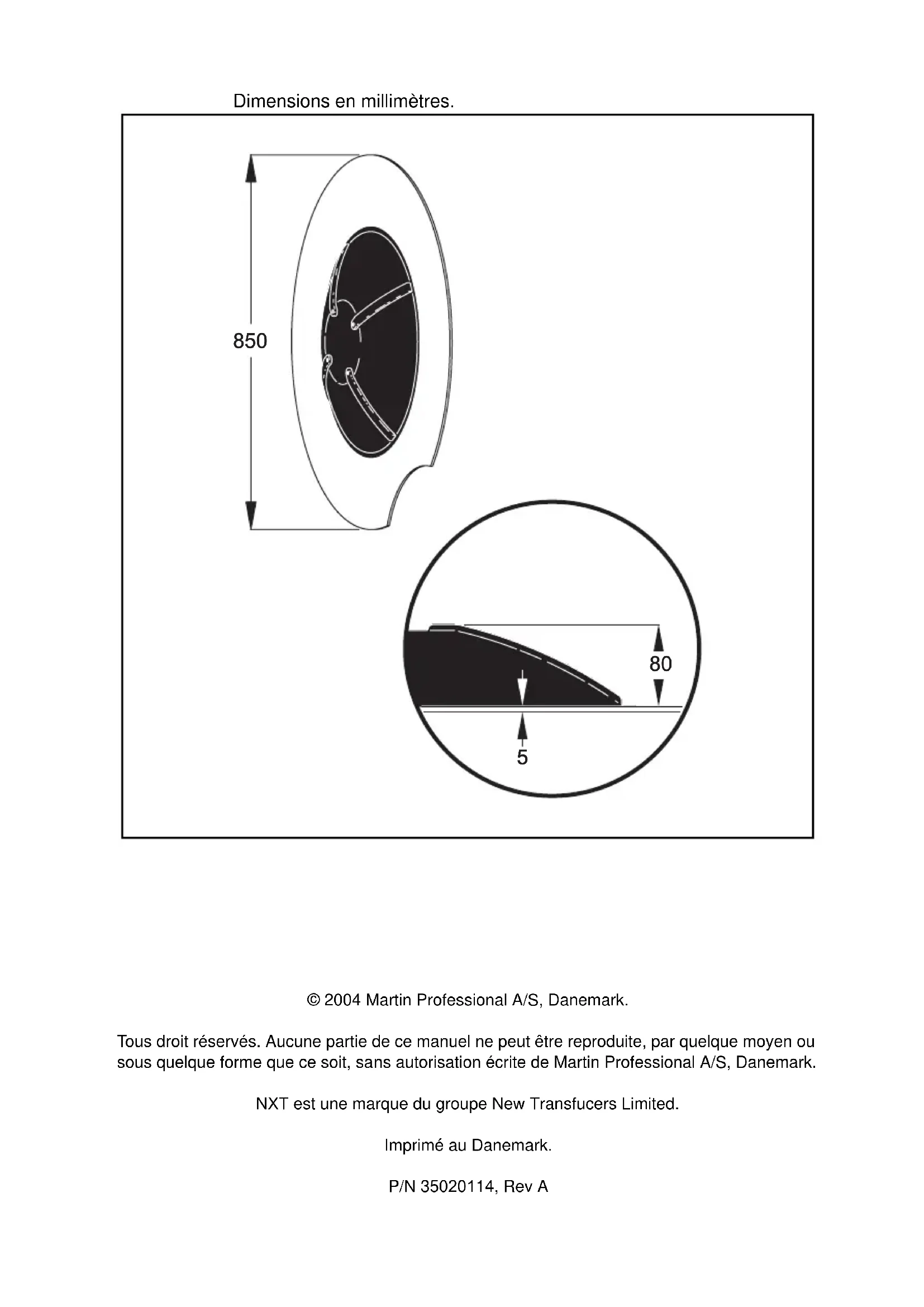 © 2004 Martin Professional A/S, Danemark. Tous droit réservés. Aucune partie de ce manuel ne peut être reproduite, par quelque moyen ou sous quelque forme que ce soit, sans autorisation écrite de Martin Professional A/S, Danemark. NXT est une marque du groupe New Transfucers Limited. Imprimé au Danemark. P/N 35020114, Rev A3 Introduction Merci d’avoir choisi l’Outdoor ViroSphere. L’Outdoor ViroSphere est un haut-parleur circulaire plat conçu pour une utilisation en extérieur lorsqu’un son omni-directionnel de haute qualité est nécessaire. La conception de l’Outdoor ViroSphere combine un design plat avec une performance audio axée sur l’intelligibilité du discours. La pression acoustique de l’Outdoor ViroSphere décroît linéairement avec la distance ce qui engendre une pression acoustique uniforme sur toute la zone de couverture. L’Outdoor ViroSphere peut être supporté par le caisson de basse Martin Architectural ViroSub ou couplé avec le système de basse déja en place. Caractéristiques