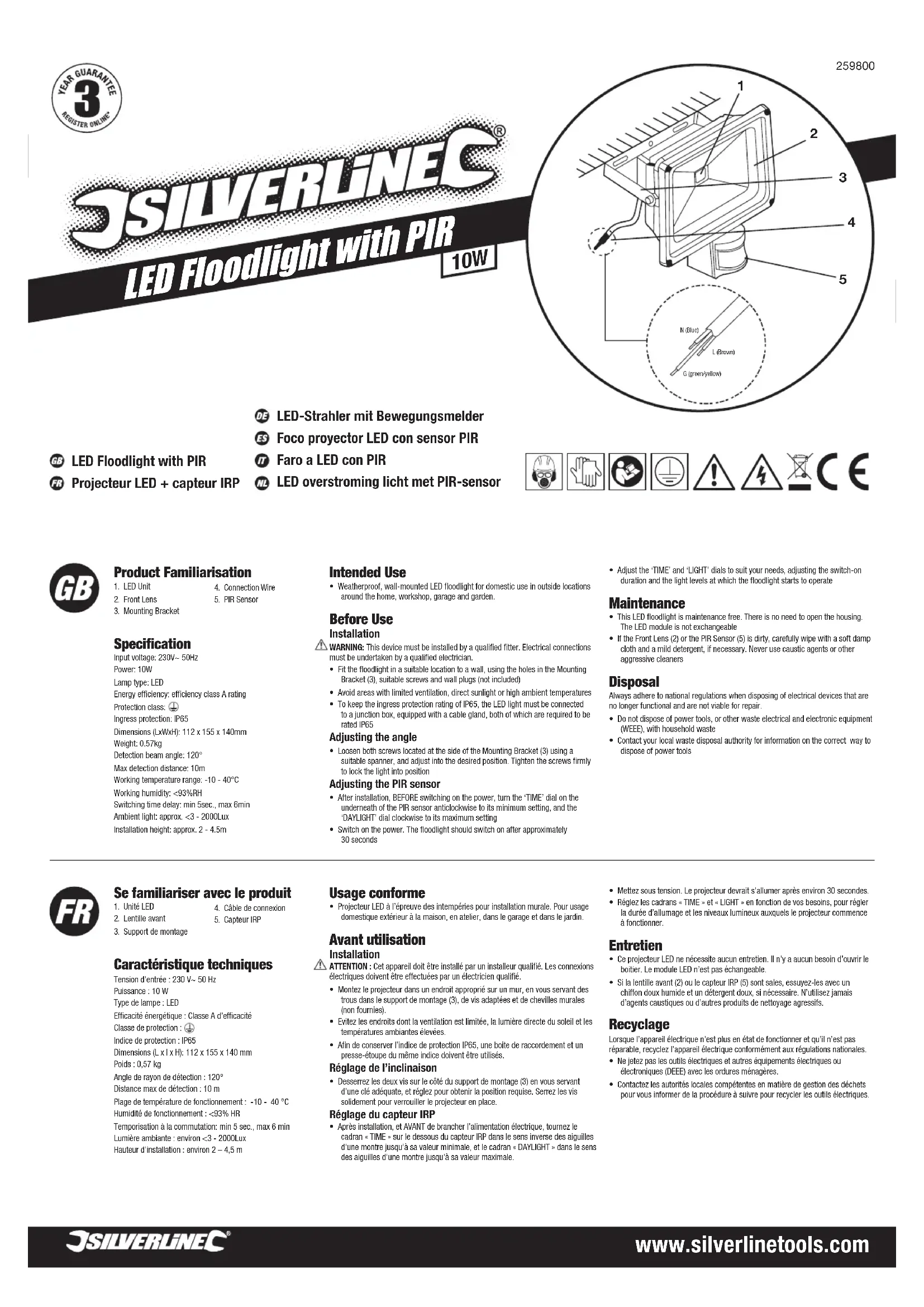 - Projecteur LED à l’épreuve des intempéries pour installation murale. Pour usage domestique extérieur à la maison, en atelier, dans le garage et dans le jardin. Avant utilisation InstallationATTENTION : Cet appareil doit être installé par un installeur qualifié. Les connexions électriques doivent être effectuées par un électricien qualifié.• Montez le projecteur dans un endroit approprié sur un mur, en vous servant des trous dans le support de montage (3), de vis adaptées et de chevilles murales (non fournies). • Evitez les endroits dont la ventilation est limitée, la lumière directe du soleil et les températures ambiantes élevées.• Afin de conserver l’indice de protection IP65, une boite de raccordement et un presse-étoupe du même indice doivent être utilisés.Réglage de l’inclinaison• Desserrez les deux vis sur le côté du support de montage (3) en vous servant d’une clé adéquate, et réglez pour obtenir la position requise. Serrez les vis solidement pour verrouiller le projecteur en place.Réglage du capteur IRP• Après installation, et AVANT de brancher l’alimentation électrique, tournez le cadran « TIME » sur le dessous du capteur IRP dans le sens inverse des aiguilles d’une montre jusqu’à sa valeur minimale, et le cadran « DAYLIGHT » dans le sens des aiguilles d’une montre jusqu’à sa valeur maximale.• Adjust the ‘TIME’ and ‘LIGHT’ dials to suit your needs, adjusting the switch-on duration and the light levels at which the floodlight starts to operate Maintenance