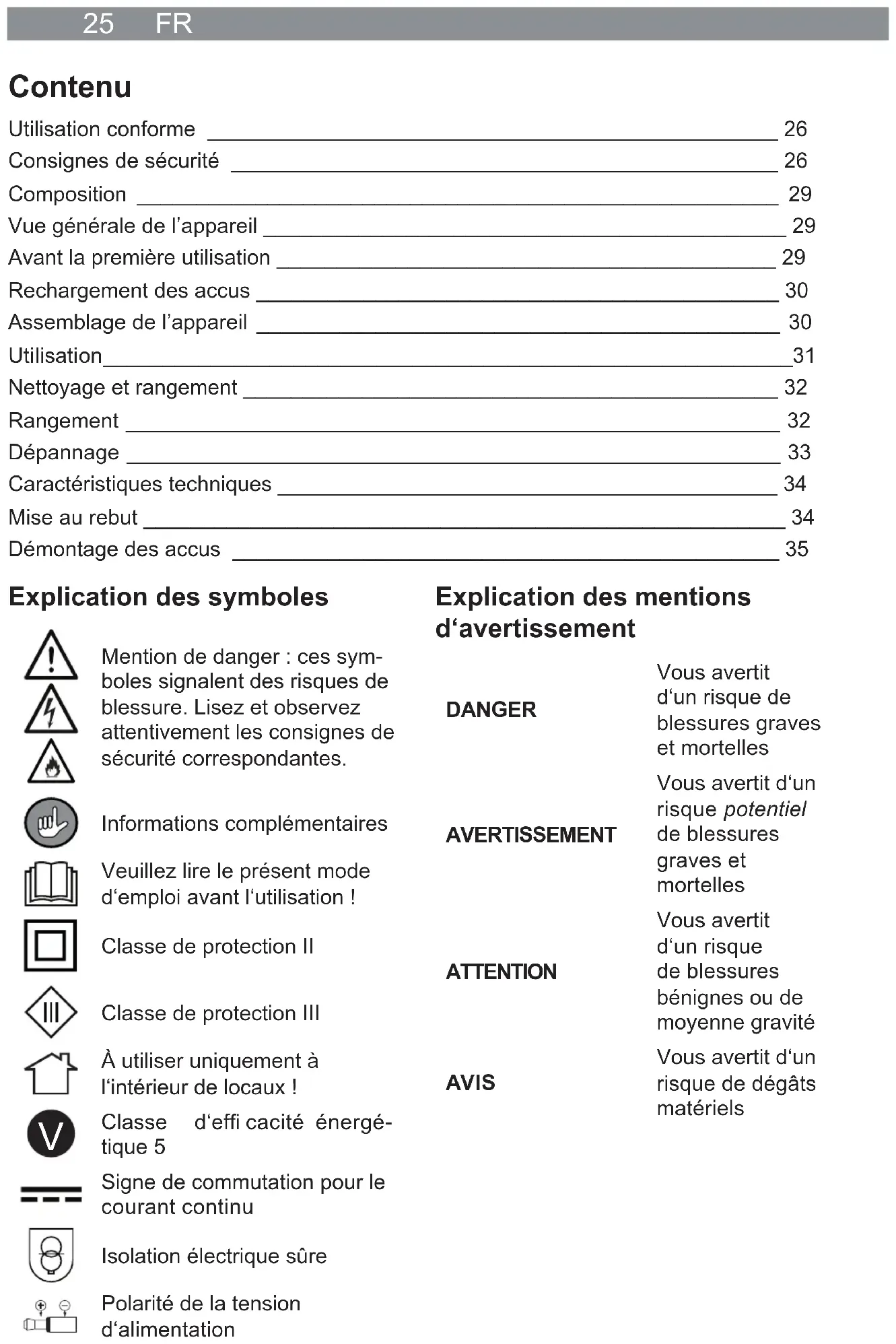 Classe d‘effi cacité énergé- tique 5 Signe de commutation pour le courant continu Isolation électrique sûre Polarité de la tension d‘alimentation Explication des mentions d‘avertissement DANGER Vous avertit d‘un risque de blessures graves et mortelles AVERTISSEMENT Vous avertit d‘un risque potentiel de blessures graves et mortelles ATTENTION Vous avertit d‘un risque de blessures bénignes ou de moyenne gravité AVIS Vous avertit d‘un risque de dégâts matérielsFR 26 Chère cliente, cher client, Nous vous félicitons d‘avoir fait l‘acquisition de notre nettoyeur de fenêtres. Veuillez lire attentivement le présent mode d‘emploi avant la première utilisation de l‘appareil et le conserver précieusement pour toute consultation ultérieure. Si vous donnez ou prêtez cet appareil à une tierce personne, n‘oubliez pas d‘y joindre ce mode d‘emploi. Il fait partie intégrante de l‘appareil. Le fabricant et l‘importateur déclinent toute responsabilité en cas de non-observation des instructions qu‘il contient. Faites attention : Les illustrations dans ce mode d‘emploi peuvent différer facilement du produit réel. Pour toute question concernant l‘appareil et ses pièces de rechange et accessoires, vous pouvez contacter le service après-vente à partir de notre site Internet : www.dspro.de/kontakt Utilisation conforme