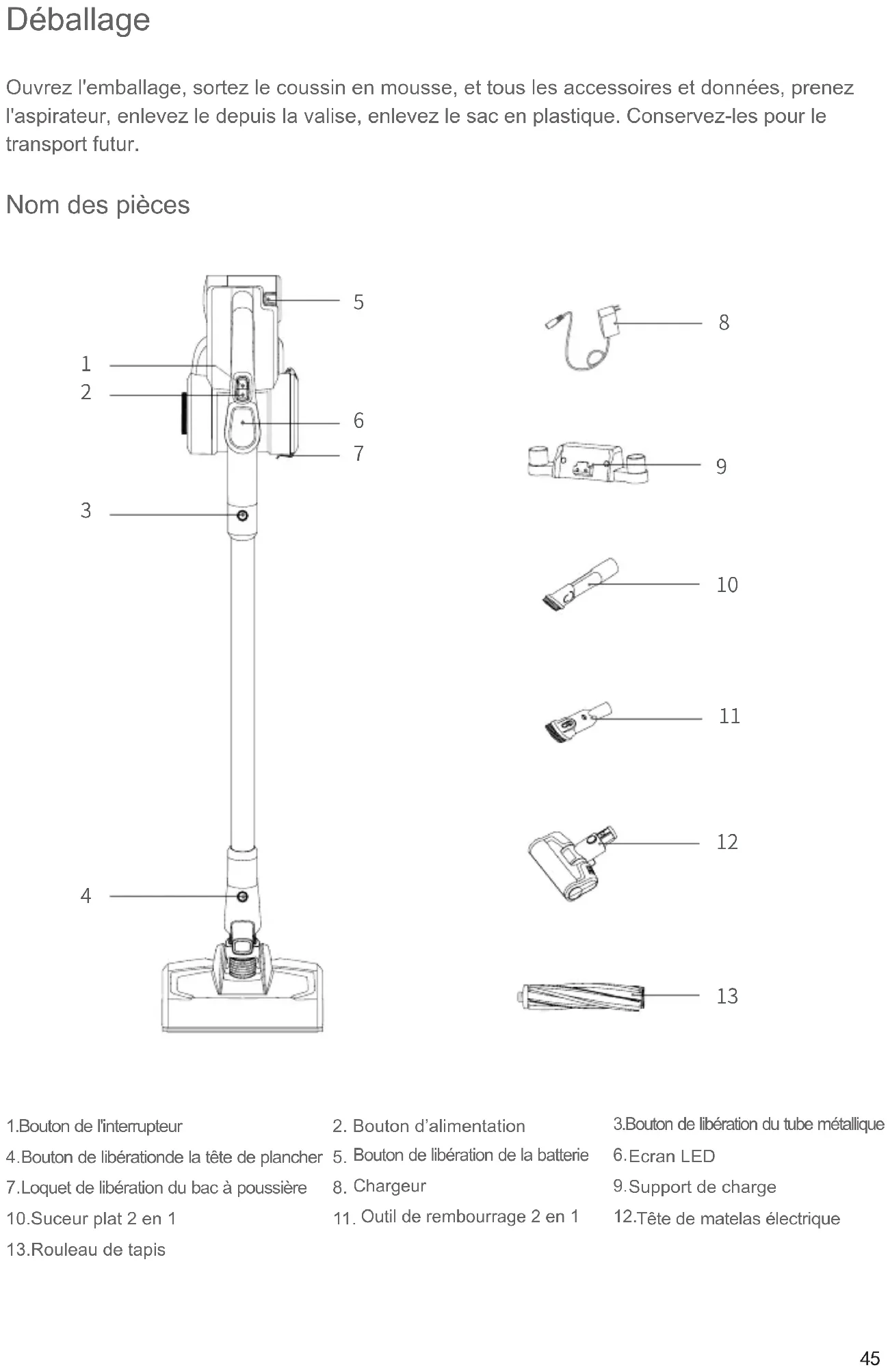 Charge de l'aspirateur Quand la puissance de l'aspirateur est insusante, chargez l'aspirateur à temps; quand la tension est trop faible, il doit protéger la batterie, l'aspirateur s'éteindra automatiquement, l'aspirateur doit être chargé à ce moment.Lors du chargement, branchez le connecteur du chargeur dans la prise ,49 Bouton de libération de la batterie Bouton de l'interrupteur Bouton d’alimentation Ecran LED Bouton de libération de la poussière Rouleau de tapis Nettoyage des sols durs, des carreaux ou des tapis à poils courts. Nettoyage du tapisà poils longs.