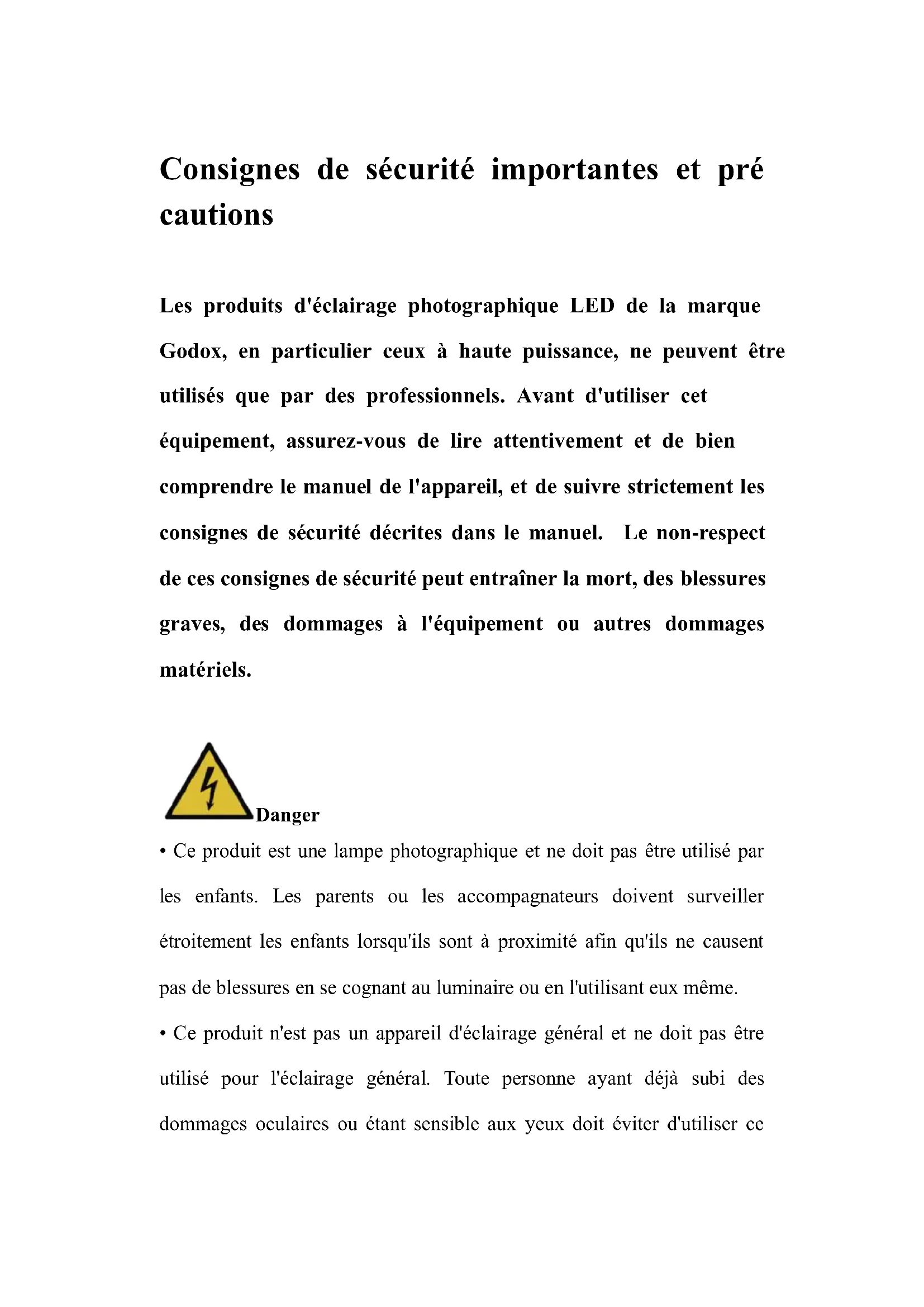 Risque lié à la lumière IRAvertissement, surface chaude !Consignes de sécurité importantes et pré cautions Les produits d'éclairage photographique LED de la marque Godox, en particulier ceux à haute puissance, ne peuvent être utilisés que par des professionnels. Avant d'utiliser cet équipement, assurez-vous de lire attentivement et de bien comprendre le manuel de l'appareil, et de suivre strictement les consignes de sécurité décrites dans le manuel. Le non-respect de ces consignes de sécurité peut entraîner la mort, des blessures graves, des dommages à l'équipement ou autres dommages matériels. Danger