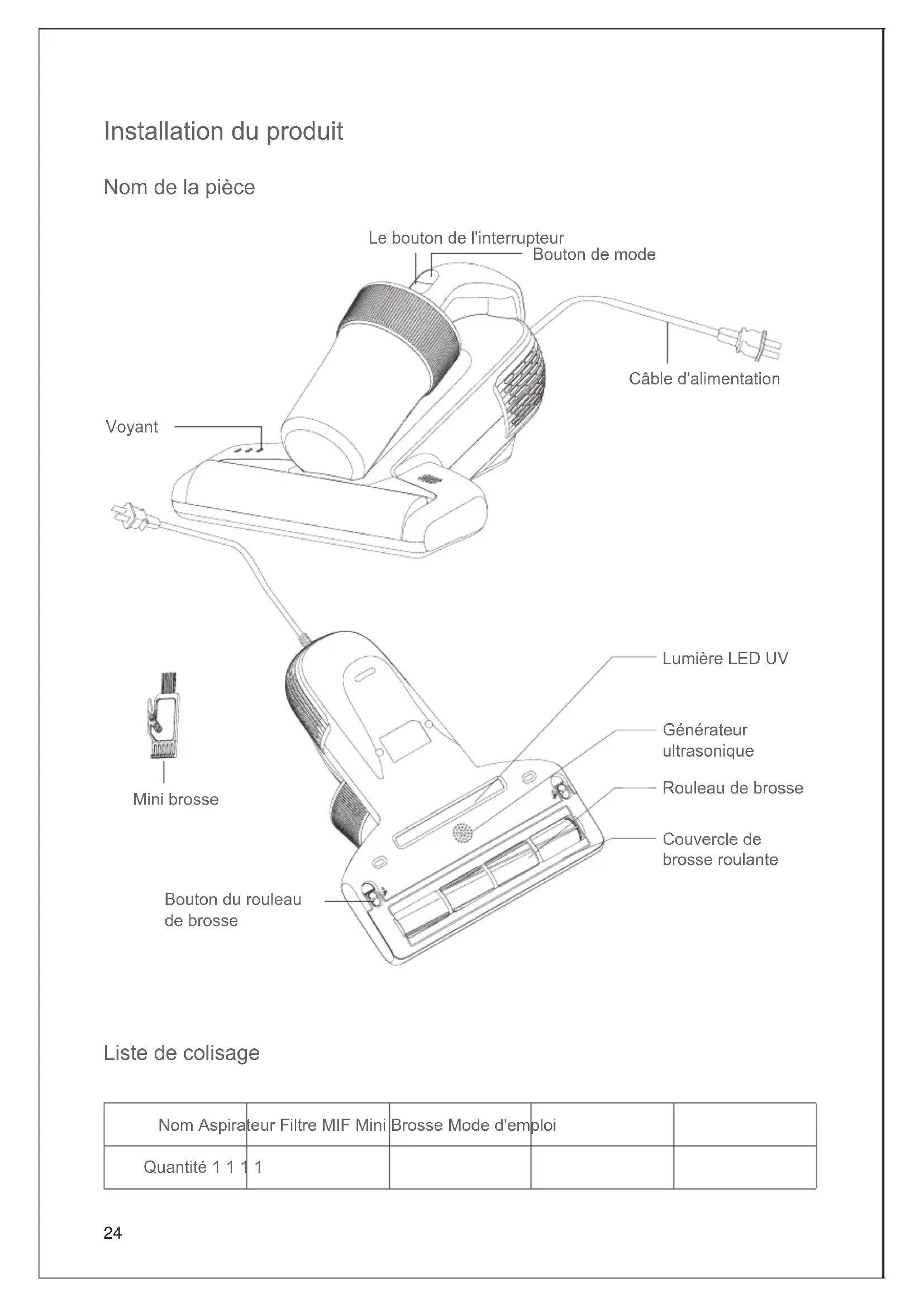 Petite brosse Ensemble de couvercle de bac à poussière rotatif Assemblage du couvercle du bac à poussière Ruban de logo Filtre métallique27 Entretien et stockage quotidiens Il est recommandé de nettoyer le bac à poussière et le coton ltre MIF après chaque utilisation pour la prochaine utilisation. Si le bac à poussière est plein de poussière pendant l'utilisation, il est recommandé de le nettoyer immédiatement, sinon cela affectera l'effet d'utilisation ; Une fois que la durée d'utilisation cumulée du ltre MIF atteint 30h-50h (selon l'utilisation du ltre MIF), il est recommandé d'acheter et de remplacer le ltre MIF à l'endroit désigné Filtre, an de ne pas affecter les performances de la machine. La pénétration des rayons ultraviolets est faible et tout papier, verre ordinaire ou plastique réduira considérablement l'intensité du rayonnement ultraviolet. De plus, les taches de poussière et d'huile sur le couvercle transparent inférieur affecteront directement sa capacité de pénétration. Le couvercle transparent doit donc être essuyé et nettoyé régulièrement pour éviter d'affecter la pénétration et la force des rayons ultraviolets. Ne touchez pas le couvercle transparent avec vos doigts, car les taches affecteront la pénétration des rayons ultraviolets. Lorsque vous n'utilisez pas la machine pendant une longue période, placez la machine dans un endroit frais et sec et ne la placez pas à la lumière directe du soleil ou dans un environnement humide.28 Précautions 1.Lisez attentivement ce manuel d'instructions avant utilisation et conservez-le correctement pour l’utilisation future. 2.Ne laissez jamais la machine fonctionner sans surveillance. 3.Veuillez éteindre l'interrupteur d'alimentation et débrancher le cordon d'alimentation si la machine doit être inactive. Ne débranchez pas le cordon d'alimentation avec les mains humides en cas de choc électrique. 4.Coupez la source d'alimentation en maintenance ou hors service. 5.Gardez la ligne d'alimentation loin des objets pointus et ne faites pas glisser le cordon pour déplacer la machine en cas d'endommagement du cordon. 6.Pour la sécurité, ne utilisez pas le produit pour nettoyer des objets chauds tels que le carbone, les mégots de cigarettes, les objets tranchants la verre brisé, les liquides corrosifs, les matériaux inammables et explosifs, l'essence et l'alcool, sinon, cela pourrait endommager le produit ou provoquer un incendie. 7.N'utilisez pas ce produit pour nettoyer l'eau ou la poussière humide, ne l'utilisez pas dans des endroits humides (tels que la salle de bain,les toilettes, buanderie, etc.) pour éviter les pannes. 8.Ne placez pas la machine près d'appareils de chauffage et ne l'exposez pas à la lumière directe du soleil en cas de risque d'incendie. 9.Gardez ce produit hors des personnes particulières telles que des enfants sans la surveillance d'un adulte. 10.N'opérez pas la machine avec l'orice d'aspiration bloqué en cas de dommages au produit. 11.Le produit est équipé d’une lumière UV, pour des raisons de sécurité, ne regardez pas au bas de la machine lorsque l'appareil est sous tension pour les rayons ultraviolets ne causer pas les dommages humaines. 12.Ne pas appliquez ce produit sur les plantes pour ne causer le domage excessive des UV et endommager les objets. 13.Ne vous asseyez PAS sur ce produit pour ne causer pas les dommages au produit. 14.Ne retirez pas le couvercle du rouleau de brosse et ne forcez pas le couvercle vers l'extérieur lorsque la machine est sous tension ou fonctionne. 15.Ce produit peut être utilisé UNIQUEMENT pour le nettoyage de textiles par exemple les matelas, couvertures, oreillers, canapés, etc. 16.Si la ligne d'alimentation est endommagé, demandez l'aide du fabricant et d'autres professionnels pour la sécurité.29 Dépannage Si le défaut existe après les solutions suivantes, contactez immédiatement le service après- vente ou le distributeur local. Problèmes Raisons possibles Solution Panne de l’alimentation La ligne d'alimentation n'est pas fermement inséré Insérez fermement la ligne d'alimentation Pas de courant sur la prise Vériez la prise Interrupteur d'alimentation non appuyé Appuyez sur le bouton Marche / Arrêt Faible puissance d'aspiration L’orice d'aspiration est bouché Nettoyez l'orice d'aspiration Accumulation de poussière sur le ltre Nettoyez le ltre Accumulation de poussière sur le cyclone Nettoyez le cyclone Panne du tube UV La fonction UV est automatiquement désactivée pour la sécurité ou la faible réexion de l'objet La fonction UV fonctionne sous la condition de moins de 3 cm de hauteur de l'objet La machine fonctionne longtemps sur la même position Déplacez la machine vers l'avant et vers l'arrière La machine est placée en la position verticale La machine n'a pas basculé de plus de 30 degrés La fenêtre du capteur est contaminée Nettoyez la fenêtre du capteur avec un chiffon à moitié sec Dommage de lumière UV Contacter le service après-vente Éteint automatiquement La coupede poussière est pleine La machine s'arrête automatiquement pour empêcher le moteur de fonctionner longtemps, si la machine s'est éteinte automatiquement, nettoyez la coupe de poussière et le ltre, débranchez la ligne d'alimentation et le réutilisez après 2 heures. Orice d'aspiration bouché Filtre bloqué Défaillance du rouleau de brosse Rouleau de brosse emmêlé avec des matières étrangères Retirez le couvercle et nettoyez le rouleau de brosse selon les instructions d'utilisation La ceinture est cassée Retirez le couvercle selon les instructions d'utilisation et vériez la courroie, s'il est cassé, contactez le service après-vente pour la réparation Remarque:Si il y un problème après l’adoptation des solutions suivantes, contactez immédiatement le service après-vente ou le distributeur local.30 Spécications du produit Paramètre technique Modèle B6 Pro Tension nominale 220V-240V