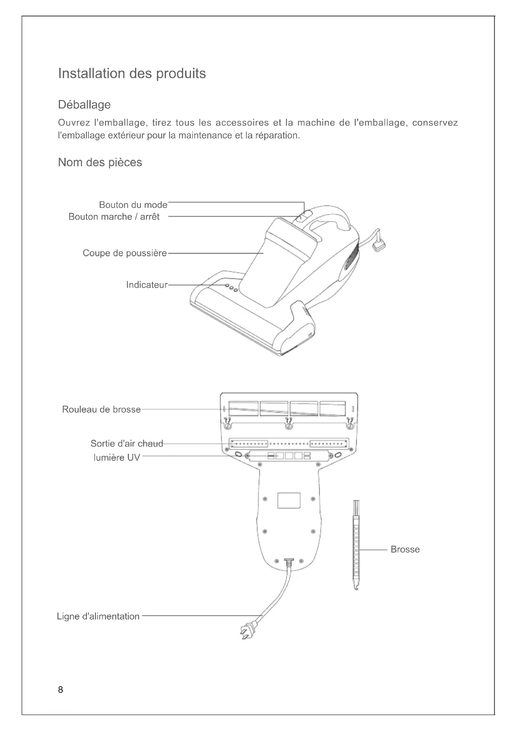 laissez pas en plein soleil ou dans un environnement humide. Précautions Lisez attentivement ce manuel d'instructions avant utilisation et conservez-le correctement pour l’utilisation future. Ne laissez jamais la machine fonctionner sans surveillance. Veuillez éteindre l'interrupteur d'alimentation et débrancher le cordon d'alimentation si la machine doit être inactive. Ne débranchez pas le cordon d'alimentation avec les mains humides en cas de choc électrique. Coupez la source d'alimentation en maintenance ou hors service. Gardez la ligne d'alimentation loin des objets pointus et ne faites pas glisser le cordon pour déplacer la machine en cas d'endommagement du cordon. Pour la sécurité, ne utilisez pas le produit pour nettoyer des objets chauds tels que le carbone, les mégots de cigarettes, les objets tranchants la verre brisé, les liquides corrosifs, les matériaux inammables et explosifs, l'essence et l'alcool, sinon, cela pourrait endommager le produit ou provoquer un incendie. N'utilisez pas ce produit pour nettoyer l'eau ou la poussière humide, ne l'utilisez pas dans des endroits humides (tels que la salle de bain,les toilettes, buanderie, etc.) pour éviter les pannes. Ne placez pas la machine près d'appareils de chauffage et ne l'exposez pas à la lumière directe12 du soleil en cas de risque d'incendie. Gardez ce produit hors des personnes particulières telles que des enfants sans la surveillance d'un adulte. N'opérez pas la machine avec l'orice d'aspiration bloqué en cas de dommages au produit. Le produit est équipé d’une lumière UV, pour des raisons de sécurité, ne regardez pas au bas de la machine lorsque l'appareil est sous tension pour les rayons ultraviolets ne causer pas les dommages humaines. Ne pas appliquez ce produit sur les plantes pour ne causer le domage excessive des UV et endommager les objets. Ne vous asseyez PAS sur ce produit pour ne causer pas les dommages au produit. Ne retirez pas le couvercle du rouleau de brosse et ne forcez pas le couvercle vers l'extérieur lorsque la machine est sous tension ou fonctionne. Ce produit peut être utilisé UNIQUEMENT pour le nettoyage de textiles par exemple les matelas, couvertures, oreillers, canapés, etc. Si la ligne d'alimentation est endommagé, demandez l'aide du fabricant et d'autres professionnels pour la sécurité. Dépannage Si le défaut existe après les solutions suivantes, contactez immédiatement le service après- vente ou le distributeur local. Problèmes Raisons possibles Solution Panne de l’alimentation La ligne d'alimentation n'est pas fermement inséré. Insérez fermement la ligne d'alimentation. Pas de courant sur la prise. Vériez la prise. Interrupteur d'alimentation non appuyé. Appuyez sur le bouton Marche / Arrêt. Faible puissance d'aspiration L’orice d'aspiration est bouché. Nettoyez l'orice d'aspiration. Accumulation de poussière sur le ltre. Nettoyez le ltre. Accumulation de poussière sur le cyclone. Nettoyez le cyclone. Accumulation de poussière sur le ltre. Nettoyez le ltre.13 Problèmes Raisons possibles Solution Panne du tube