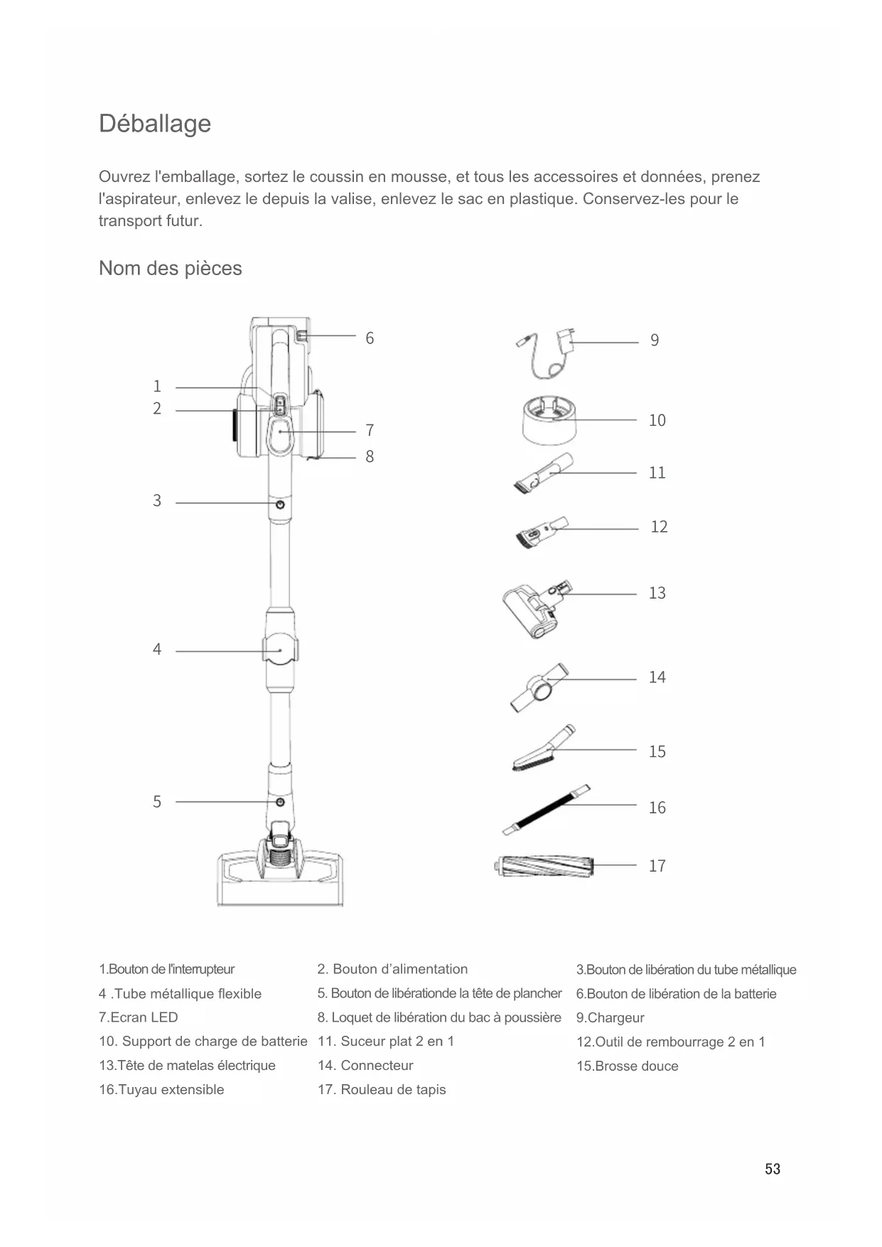 3.Bouton de libération du tube métallique 6.Bouton de libération de la batterie 9.Chargeur 12.Outil de rembourrage 2 en 1 15.Brosse douce