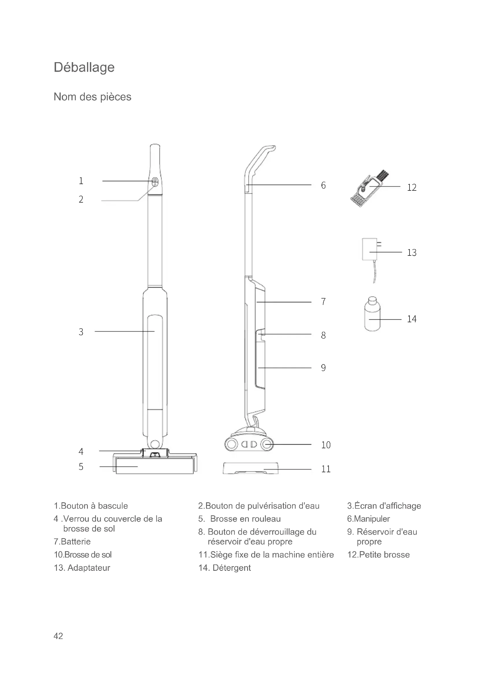 un court-circuit et endommagera le produit, et il ne sera pas utilisé normalement. Dépannage Avant de coner le service de maintenance, veuillez vérier les points suivants: Phénomène d'échec Raison possible Solution La brosse à rouler ne tourne pas Pas de batterie Charger l'épurateur La brosse à rouler ne tourne pas La brosse à rouleau est pressée par des objets lourds ou enroulée dans les poils excessifs Enlevez les objets lourds et nettoyez les cheveux La brosse à rouler ne tourne pas Mauvais moteur Remplacez le moteur Pompe sans eau L'eau du réservoir d'eau propre est épuisée Remplissez le réservoir d'eau propre Pompe sans eau Bloqué par des objets étrangers Nettoyez la saleté sur la buse de la buse, nettoyez le réservoir d'eaux usées L'indicateur de pleine eau s'allume Le réservoir de récupération est plein ou sale Vidangez les eaux usées à temps et nettoyez le réservoir d'eaux usées L'indicateur de pénurie d'eau est allumé Pénurie d'eau dans le réservoir de purication d'eau Remplissez le réservoir d'eau propre à temps L'indicateur de batterie sur l'écran est rouge La batterie est faible Recharger Remarque: si le guide de dépannage ci-dessus ne fournit pas de solution, veuillez contacter le service après- vente ou l'agent local pour obtenir des conseils.50 Spécication de produit Paramètres techniques Numéro de modèle SF8 Tension nominale 14.4V Puissance d'entrée nominale 60W Entrée adaptateur 100-240V~ 50-60Hz Sortie adaptateur 17.4V 600mA Puissance nominale du moteur de brosse au sol 25W Puissance de la pompe de pulvérisation d'eau