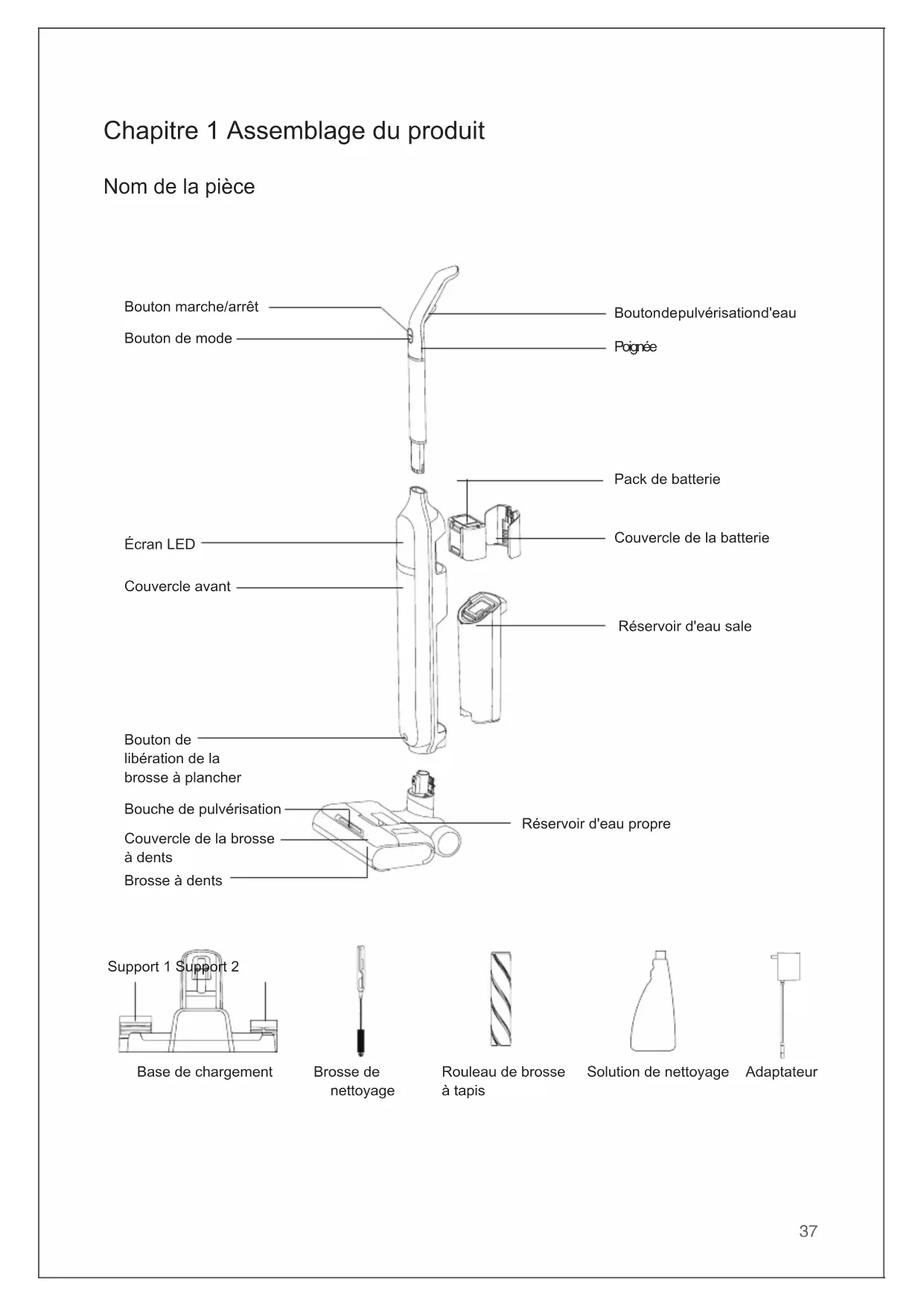 Nom de la pièce Corps principal Poignée Assemblage de la brosse à plancher Pack de batterie Base de chargement Adaptateur Quantité 1 1 1 1 1 1 Nom de la pièce Solution de nettoyage Brosse de nettoyage Support 1 Support 2 Rouleau de brosse à tapis Mode d'emploi Quantité 1 1 1 1 1 139