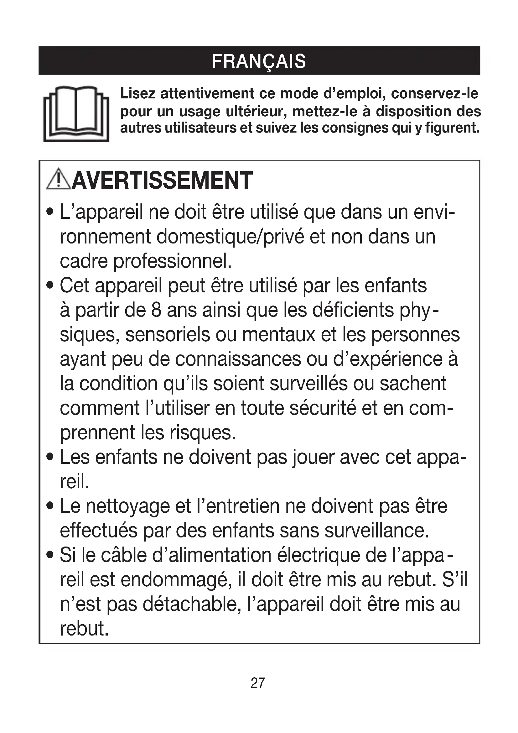 - Cet appareil peut être utilisé par les enfants à partir de 8ans ainsi que les déficients phy