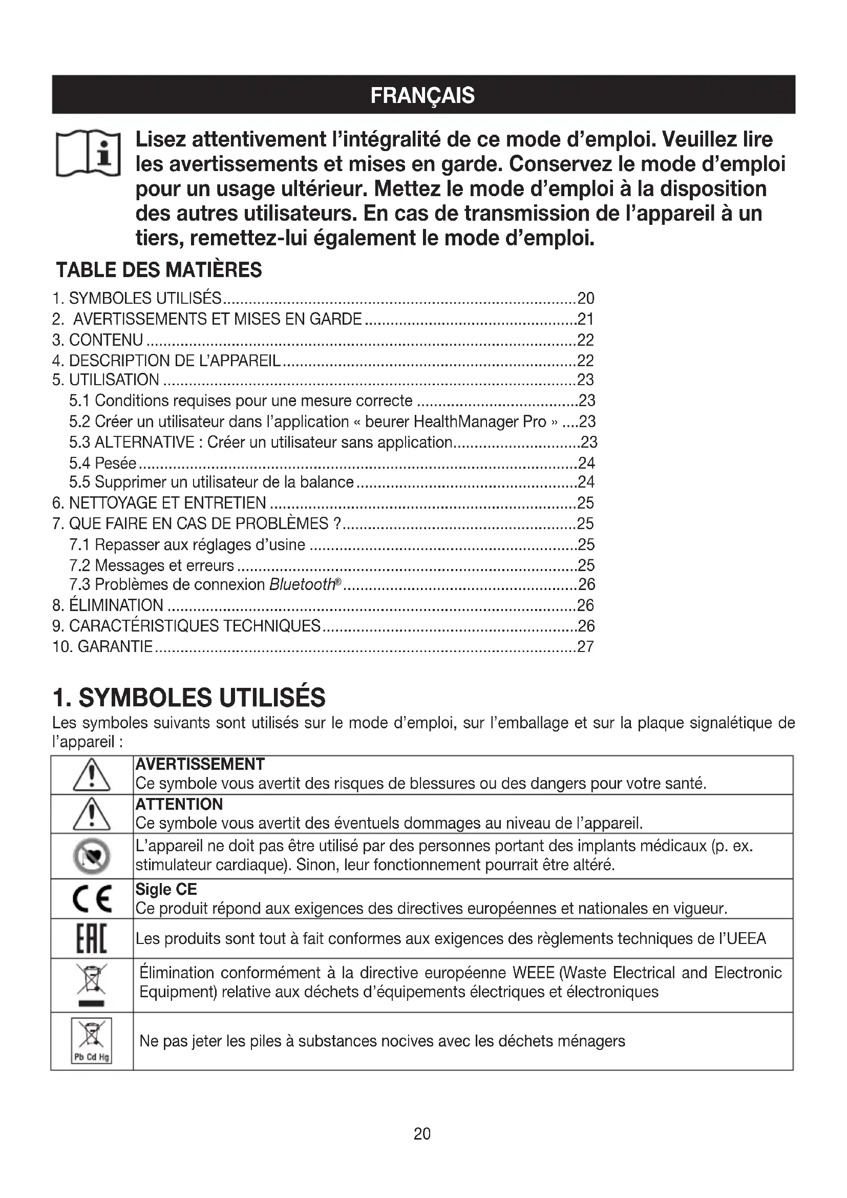Les symboles suivants sont utilisés sur le mode d’emploi, sur l’emballage et sur la plaque signalétique de l’appareil: AVERTISSEMENT Ce symbole vous avertit des risques de blessures ou des dangers pour votre santé. ATTENTION Ce symbole vous avertit des éventuels dommages au niveau de l’appareil. L’appareil ne doit pas être utilisé par des personnes portant des implants médicaux (p. ex. stimulateur cardiaque). Sinon, leur fonctionnement pourrait être altéré. Sigle CE Ce produit répond aux exigences des directives européennes et nationales en vigueur. Les produits sont tout à fait conformes aux exigences des règlements techniques de l’UEEA Élimination conformément à la directive européenne WEEE(Waste Electrical and Electronic Equipment) relative aux déchets d’équipements électriques et électroniques Ne pas jeter les piles à substances nocives avec les déchets ménagers21 Marque UKCA (UK Conformity Assessed) Fabricant Séparer les composants d’emballage et les éliminer conformément aux prescriptions com