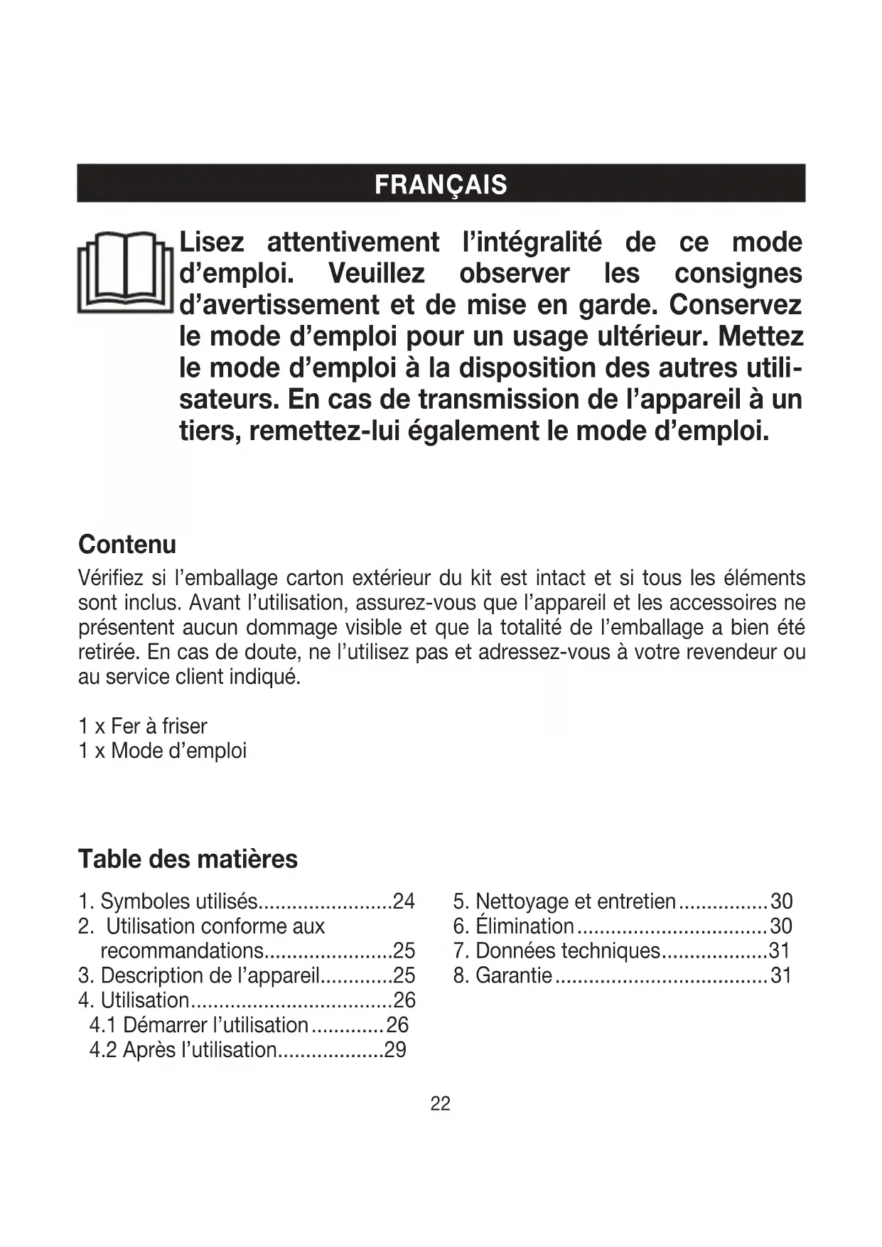 sateurs. En cas de transmission de l’appareil à un tiers, remettez-lui également le mode d’emploi. Contenu Vérifiez si l’emballage carton extérieur du kit est intact et si tous les éléments sont inclus. Avant l’utilisation, assurez-vous que l’appareil et les accessoires ne présentent aucun dommage visible et que la totalité de l’emballage a bien été retirée. En cas de doute, ne l’utilisez pas et adressez-vous à votre revendeur ou au service client indiqué. 1 x Fer à friser 1x Mode d’emploi