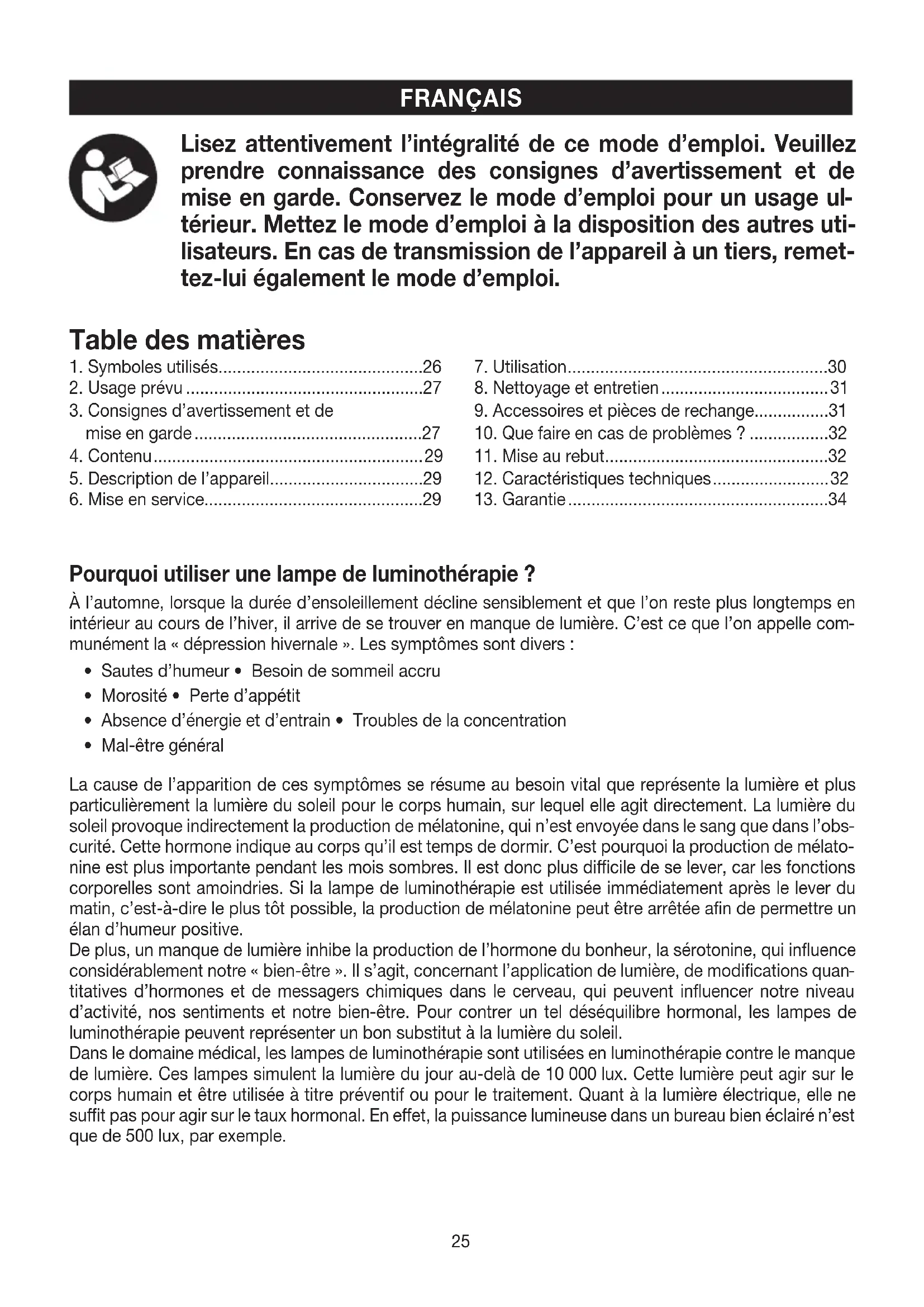 térieur. Mettez le mode d’emploi à la disposition des autres uti- lisateurs. En cas de transmission de l’appareil à un tiers, remet- tez-lui également le mode d’emploi. Pourquoi utiliser une lampe de luminothérapie? À l’automne, lorsque la durée d’ensoleillement décline sensiblement et que l’on reste plus longtemps en intérieur au cours de l’hiver, il arrive de se trouver en manque de lumière. C’est ce que l’on appelle com