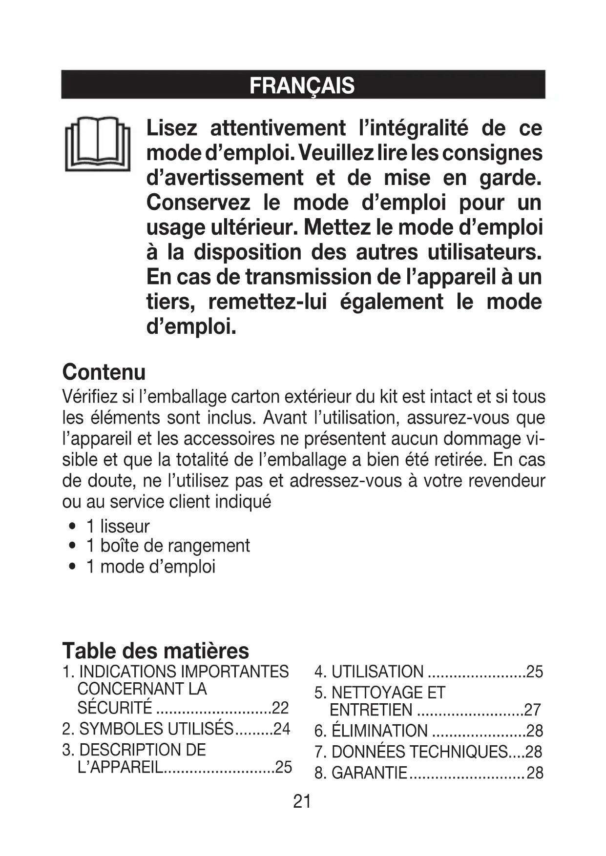 Further information on the warranty and warranty conditions can be found in the warranty leaflet supplied. Subject to errors and changes21 FRANÇAIS Lisez attentivement l’intégralité de ce mode d’emploi. Veuillez lire les consignes d’avertissement et de mise en garde. Conservez le mode d’emploi pour un usage ultérieur. Mettez le mode d’emploi à la disposition des autres utilisateurs. En cas de transmission de l’appareil à un tiers, remettez-lui également le mode d’emploi.