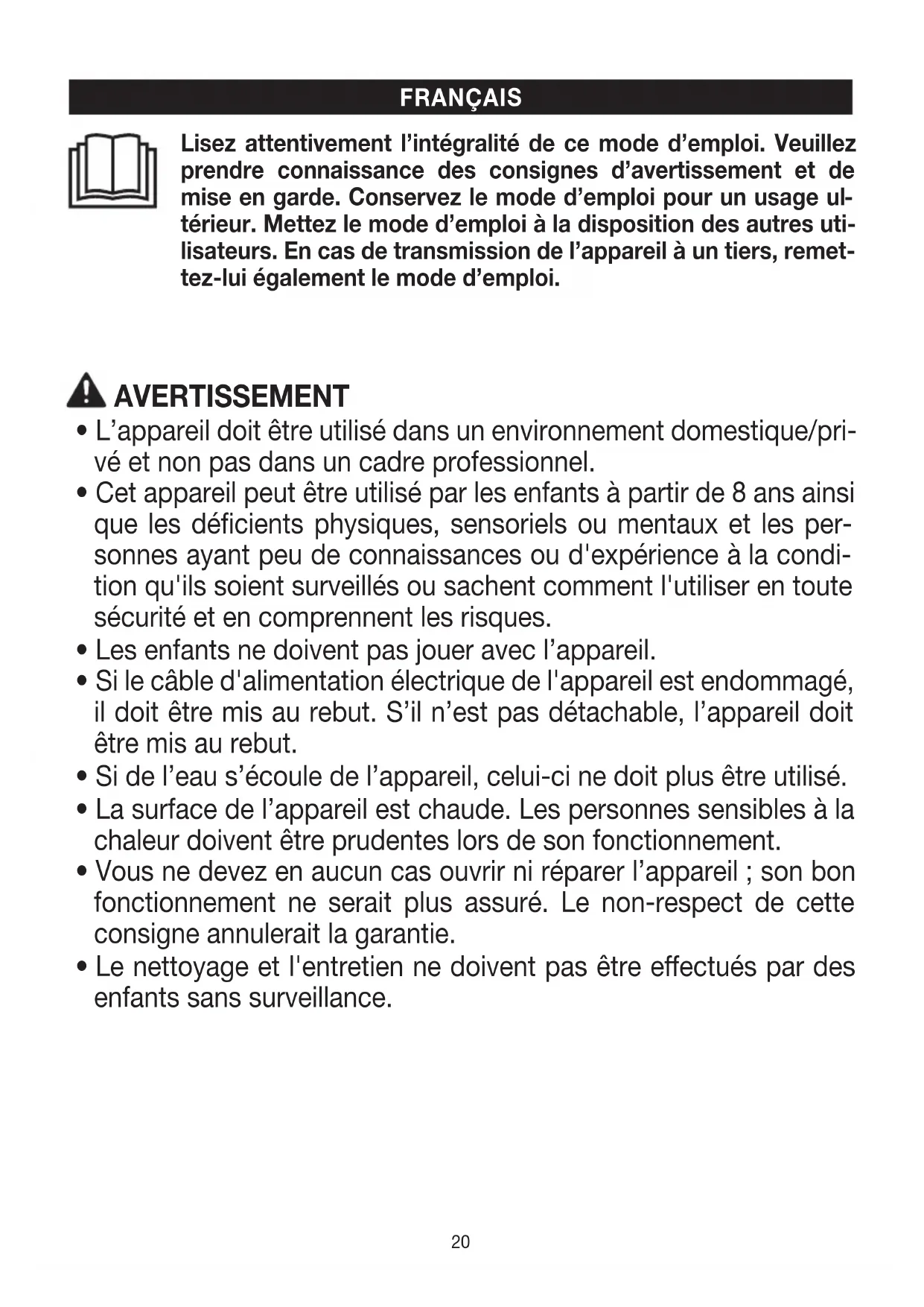 térieur. Mettez le mode d’emploi àla disposition des autres uti- lisateurs. En cas de transmission de l’appareil àun tiers, remet- tez-lui également le mode d’emploi. FRANÇAIS AVERTISSEMENT