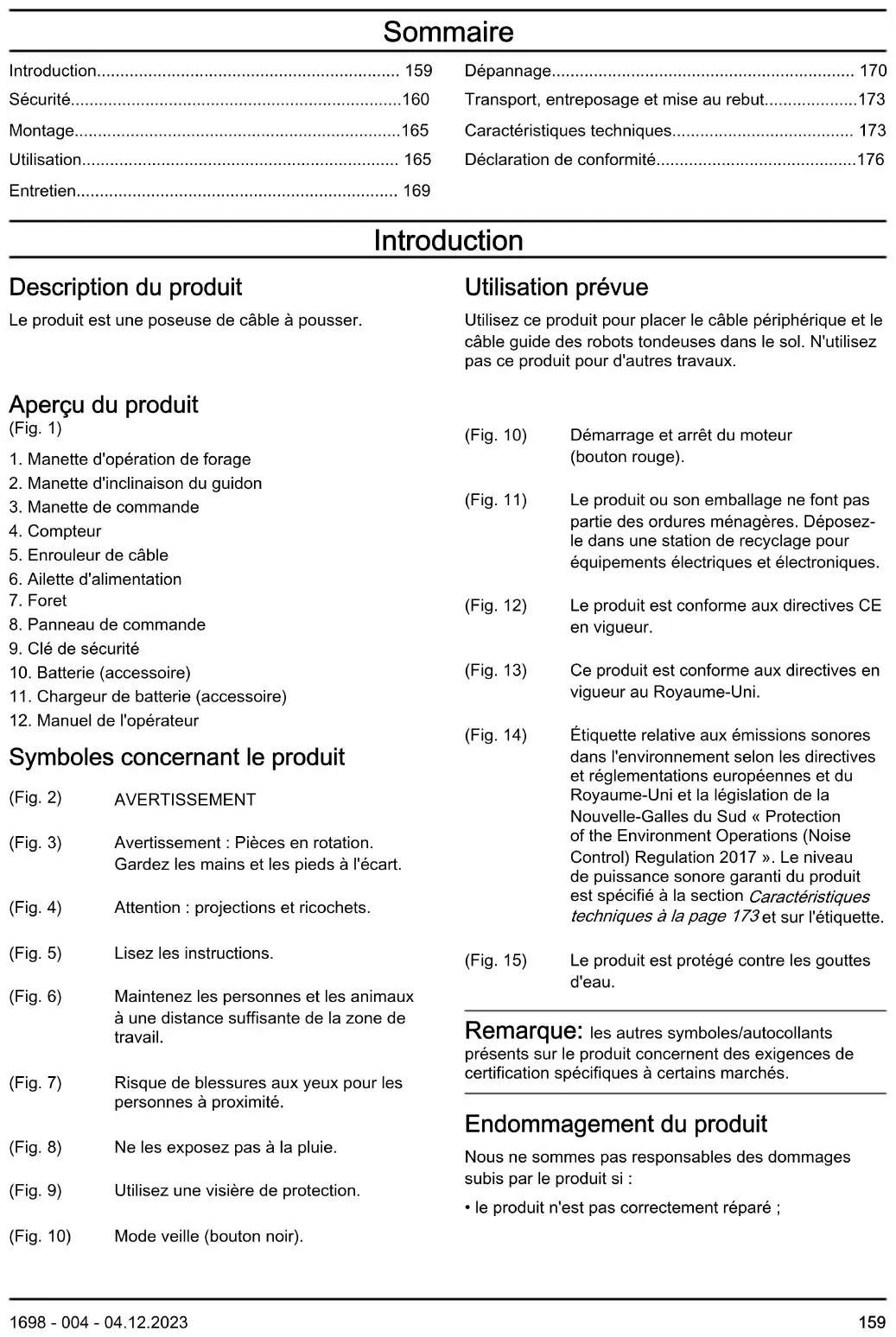 - Déclaration de conformité Introduction Description du produit Le produit est une poseuse de câble à pousser. Utilisation prévue Utilisez ce produit pour placer le câble périphérique et le câble guide des robots tondeuses dans le sol. N'utilisez pas ce produit pour d'autres travaux. Aperçu du produit (Fig. 1) p. 176