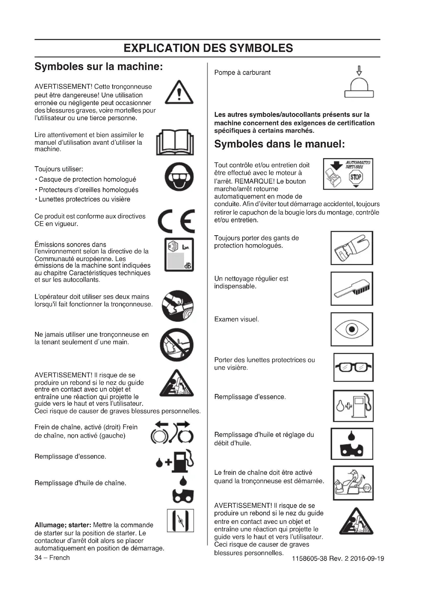 Les autres symboles/autocollants présents sur la machine concernent des exigences de certification spécifiques à certains marchés. Symboles dans le manuel: Tout contrôle et/ou entretien doit être effectué avec le moteur à l’arrêt. REMARQUE! Le bouton marche/arrêt retourne automatiquement en mode de conduite. Afin d’éviter tout démarrage accidentel, toujours retirer le capuchon de la bougie lors du montage, contrôle et/ou entretien. Toujours porter des gants de protection homologués. Un nettoyage régulier est indispensable. Examen visuel. Porter des lunettes protectrices ou une visière. Remplissage d’essence. Remplissage d’huile et réglage du débit d’huile. Le frein de chaîne doit être activé quand la tronçonneuse est démarrée. AVERTISSEMENT! Il risque de se produire un rebond si le nez du guide entre en contact avec un objet et entraîne une réaction qui projette le guide vers le haut et vers l’utilisateur. Ceci risque de causer de graves blessures personnelles.SOMMAIRE French – 35 1158605-38 Rev. 2 2016-09-19 Sommaire