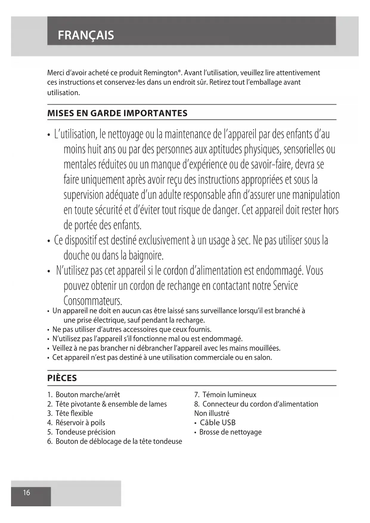 AE16 Merci d’avoir acheté ce produit Remington®. Avant l’utilisation, veuillez lire attentivement ces instructions et conservez-les dans un endroit sûr. Retirez tout l’emballage avant utilisation.