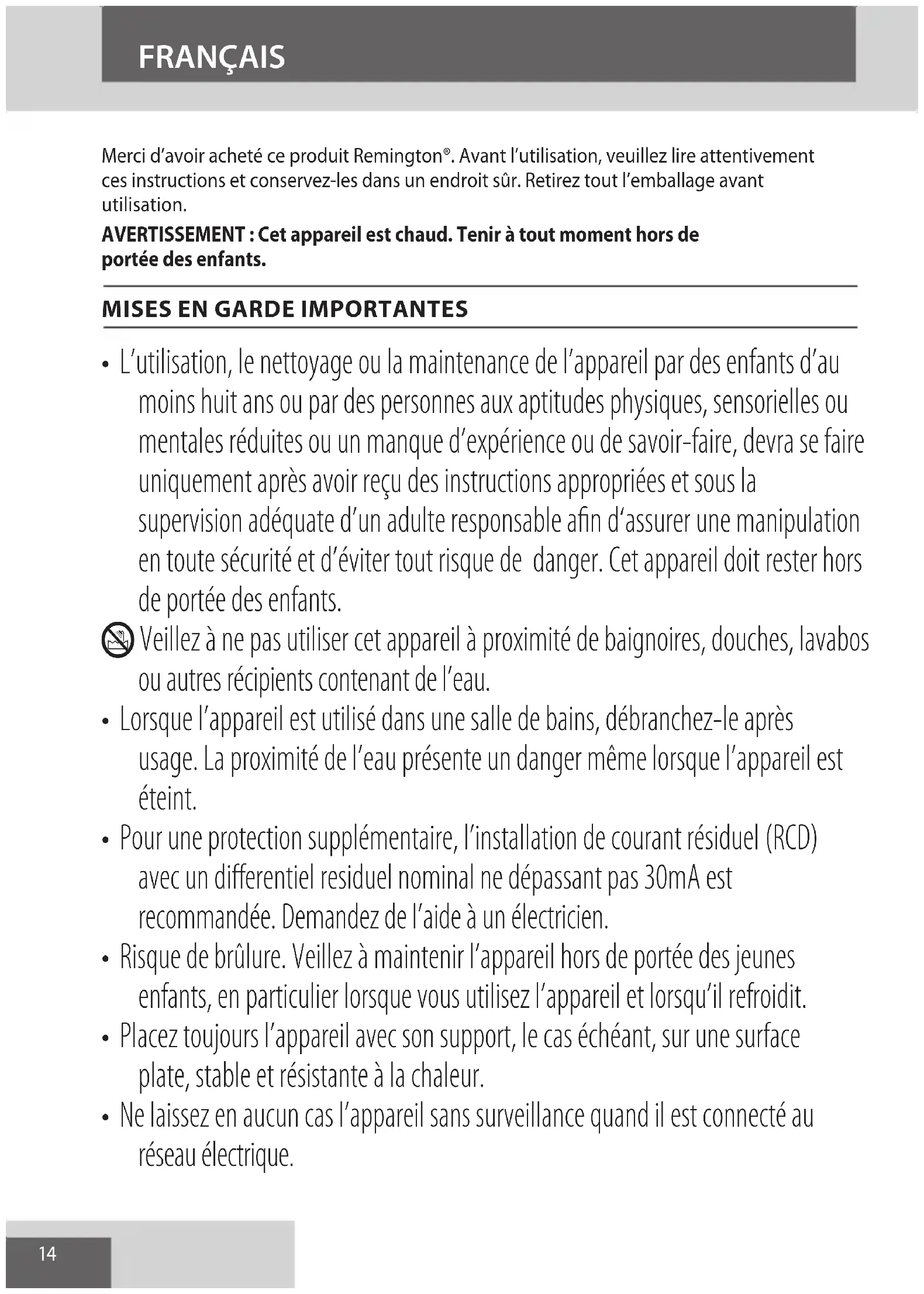AE14 Merci d’avoir acheté ce produit Remington®. Avant l’utilisation, veuillez lire attentivement ces instructions et conservez-les dans un endroit sûr. Retirez tout l’emballage avant utilisation.
