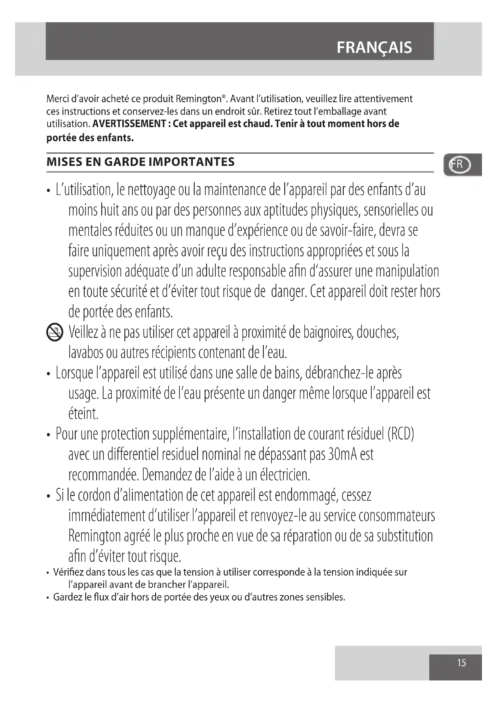 - Si le cordon d’alimentation de cet appareil est endommagé, cessez immédiatement d’utiliser l’appareil et renvoyez-le au service consommateurs Remington agréé le plus proche en vue de sa réparation ou de sa substitution afin d’éviter tout risque.