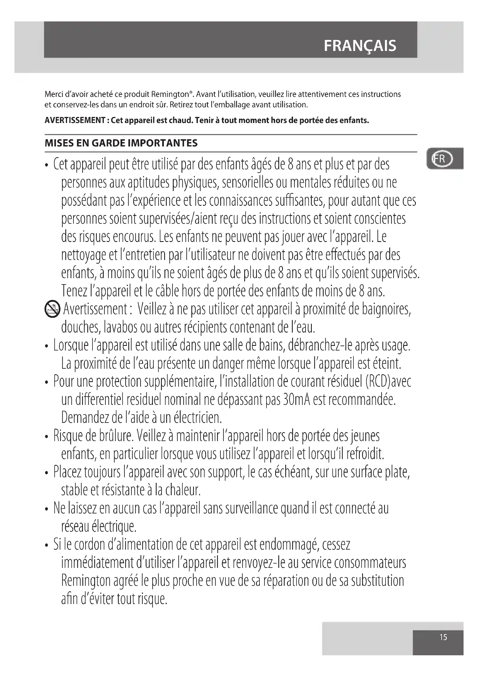 - Si le cordon d’alimentation de cet appareil est endommagé, cessez immédiatement d’utiliser l’appareil et renvoyez-le au service consommateurs Remington agréé le plus proche en vue de sa réparation ou de sa substitution afin d’éviter tout risque. FRANÇAIS