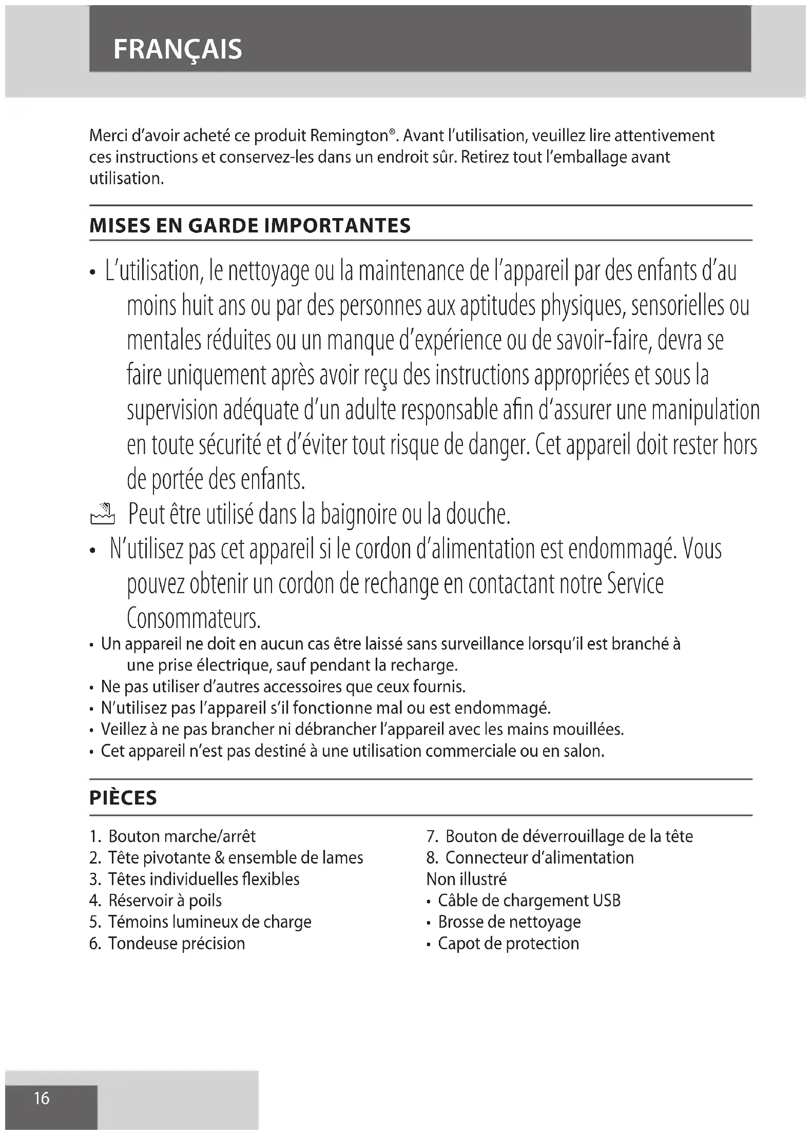 AE16 FRANÇAIS Merci d’avoir acheté ce produit Remington®. Avant l’utilisation, veuillez lire attentivement ces instructions et conservez-les dans un endroit sûr. Retirez tout l’emballage avant utilisation.