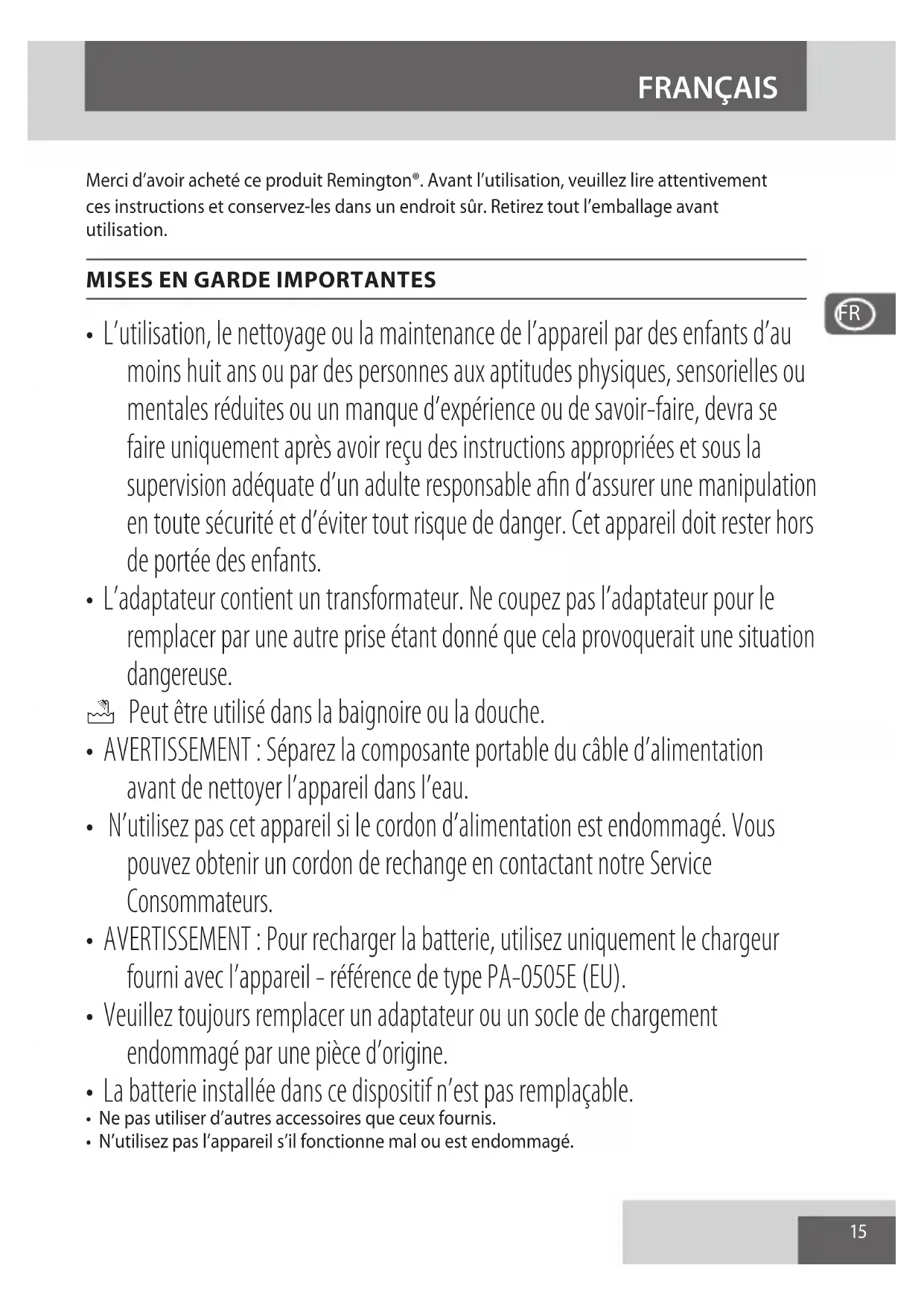 An d’éviter les problèmes occasionnés à l’environnement et à la santé par des substances dangereuses, les appareils et les batteries rechargeables et non rechargeables présentant l’un de ces symboles ne doivent pas être éliminés avec les déchets municipaux non triés. Éliminez dans tous les cas les produits électriques et électroniques et, le cas échéant, les batteries rechargeables et non rechargeables, dans un centre ociel et approprié de collecte/recyclage.19 Gracias por comprar nuestro nuevo producto Remington®. Lea detenidamente las instrucciones y guárdelas en un lugar seguro. Retire todo el embalaje antes de usar el producto.