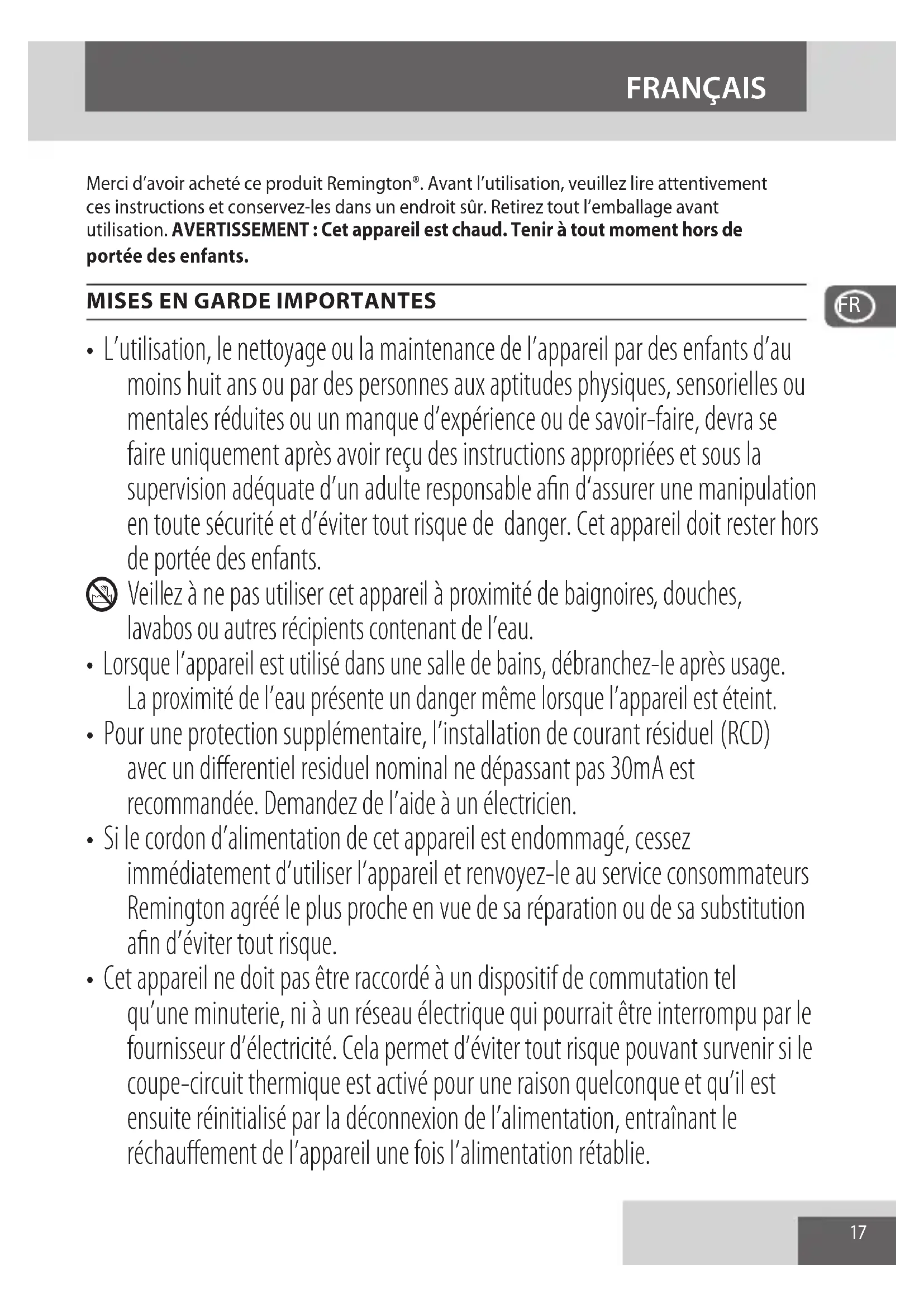 - Si le cordon d’alimentation de cet appareil est endommagé, cessez immédiatement d’utiliser l’appareil et renvoyez-le au service consommateurs Remington agréé le plus proche en vue de sa réparation ou de sa substitution afin d’éviter tout risque.