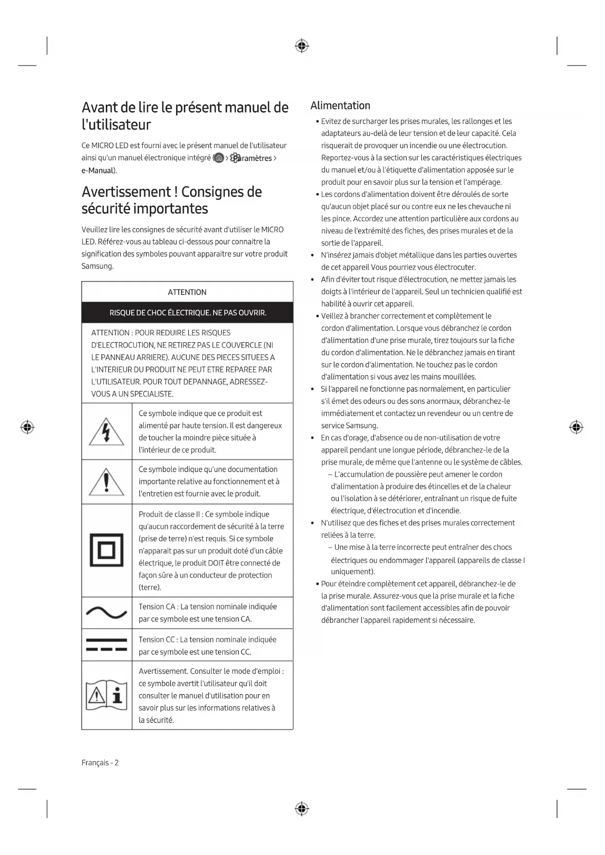 - Aus Sicherheitsgründen dürfen Sie nicht versuchen, den Akku zu entnehmen. Wird der Akku nicht ordnungsgemäß entfernt, kann dies zu Schäden an Akku und Gerät, zu Verletzungen und/oder zu einer Beeinträchtigung der Sicherheit des Geräts führen. Deutsch - 11 DeutschAvant de lire le présent manuel de l'utilisateur Ce MICRO LED est fourni avec le présent manuel de l'utilisateur ainsi qu'un manuel électronique intégré ( > Paramètres > e-Manual). Avertissement! Consignes de sécurité importantes Veuillez lire les consignes de sécurité avant d'utiliser le MICRO LED. Référez-vous au tableau ci-dessous pour connaitre la signification des symboles pouvant apparaitre sur votre produit Samsung. ATTENTION RISQUE DE CHOC ÉLECTRIQUE. NE PAS OUVRIR.