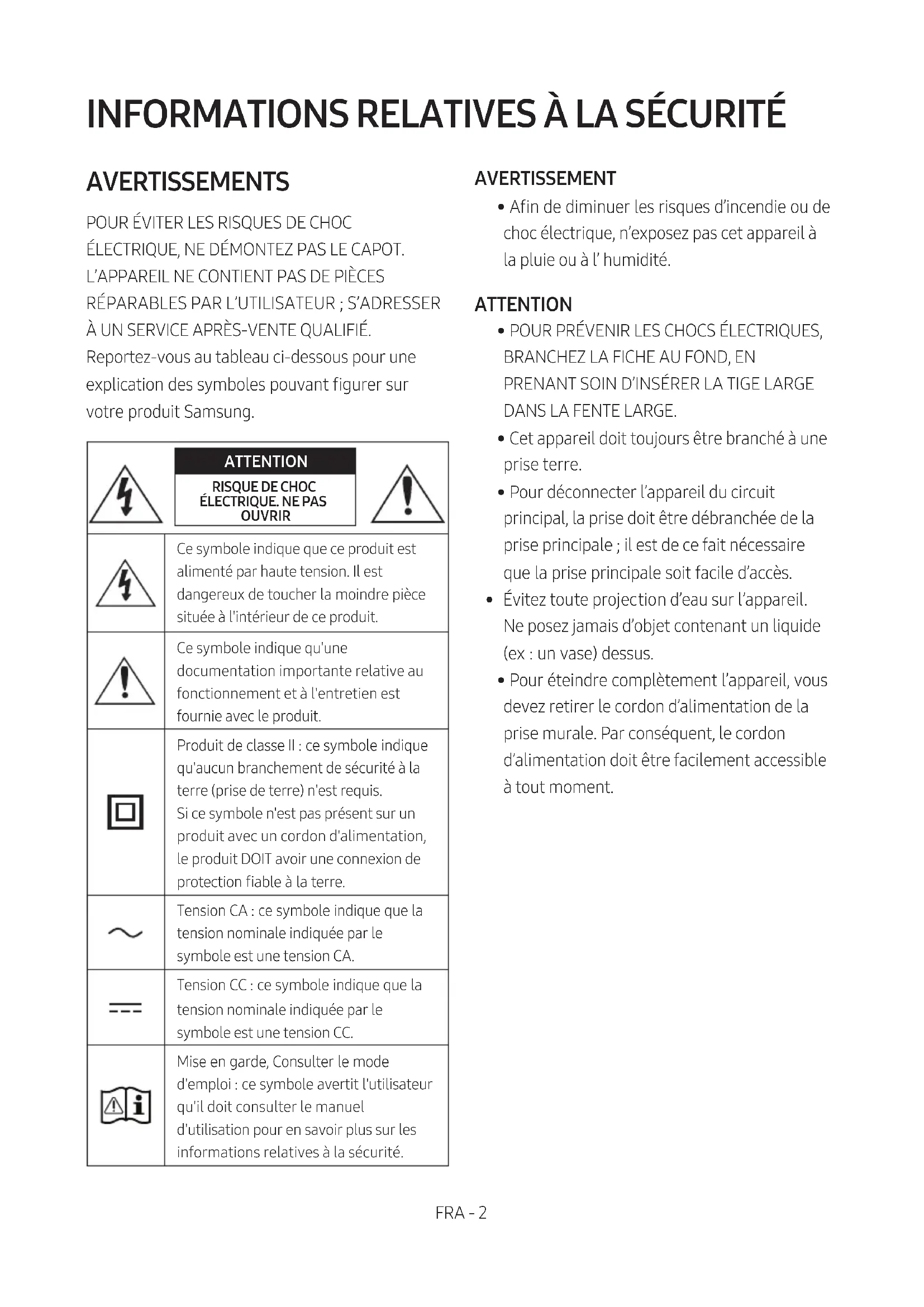 ÉLECTRIQUE, NE DÉMONTEZ PAS LE CAPOT. L’APPAREIL NE CONTIENT PAS DE PIÈCES RÉPARABLES PAR L’UTILISATEUR ; S’ADRESSER À UN SERVICE APRÈS-VENTE QUALIFIÉ. Reportez-vous au tableau ci-dessous pour une explication des symboles pouvant gurer sur votre produit Samsung. ATTENTION RISQUE DE CHOC ÉLECTRIQUE. NE PAS OUVRIRCe symbole indique que ce produit est alimenté par haute tension. Il est dangereux de toucher la moindre pièce située à l'intérieur de ce produit.Ce symbole indique qu'une documentation importante relative au fonctionnement et à l'entretien est fournie avec le produit.Produit de classeII: ce symbole indique qu'aucun branchement de sécurité à la terre (prise de terre) n'est requis. Si ce symbole n'est pas présent sur un produit avec un cordon d'alimentation, le produit DOIT avoir une connexion de protection able à la terre.Tension CA: ce symbole indique que la tension nominale indiquée par le symbole est une tension CA.Tension CC: ce symbole indique que la tension nominale indiquée par le symbole est une tension CC.Mise en garde, Consulter le mode d'emploi: ce symbole avertit l'utilisateur qu'il doit consulter le manuel d'utilisation pour en savoir plus sur les informations relatives à la sécurité. AVERTISSEMENT