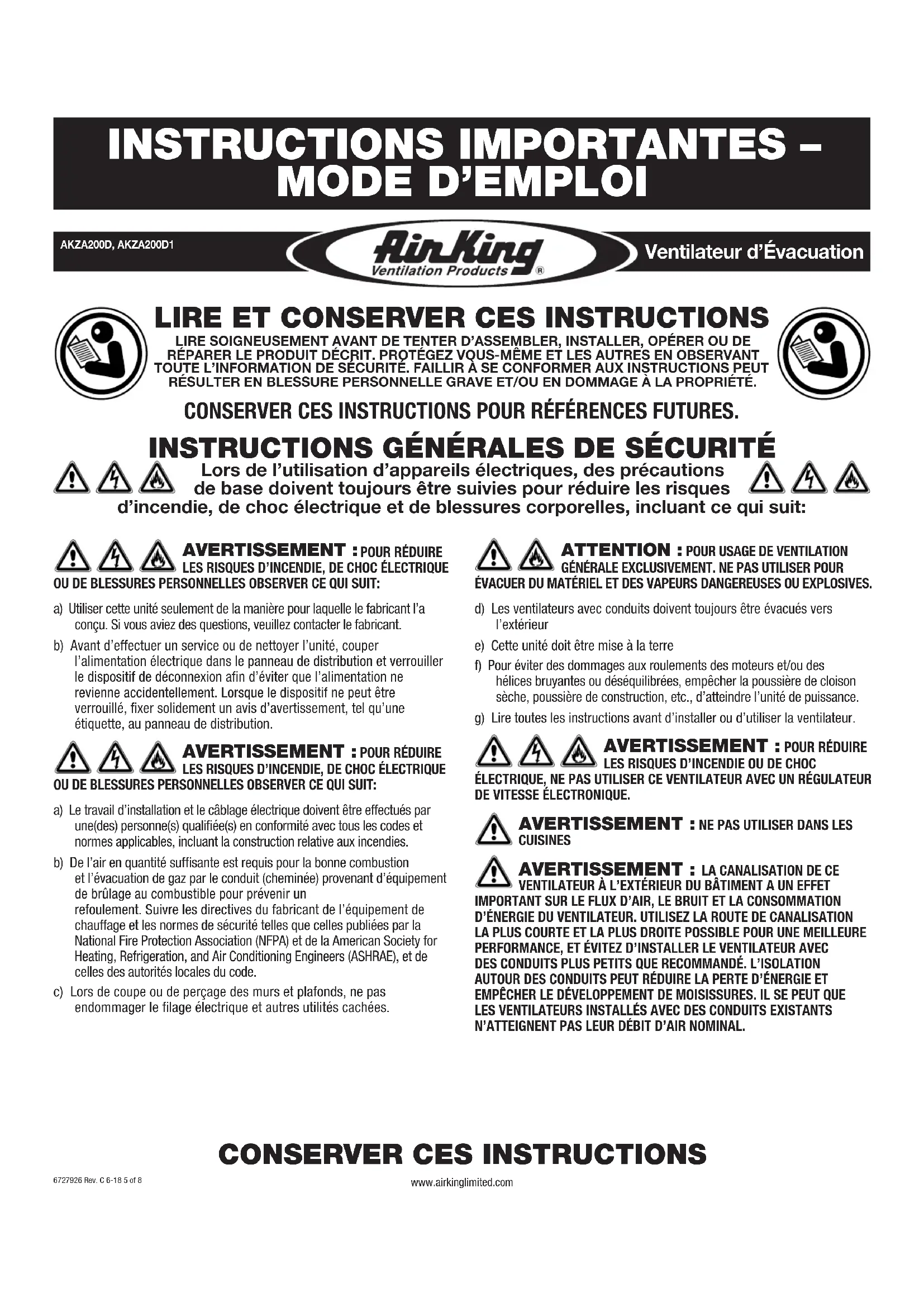 montage Châssis Écrou Tige filetée Figure 5 Châssis Conduit Collet de conduit Figure 4www.airkinglimited.com6727926 Rev. C 6-18 7 of 8 Guide de dépannage Trouble Cause Possible Solution Suggérée 1. Le ventilateur ne fonctionne pas lorsque 1a. Un fusible peut être grillé ou un disjoncteur 1a. Remplacer le fusible ou réinitialiser le disjoncteur. l’interrupteur est à la position en marche. peut être décle.nché. 1b. La fiche de raccord du moteur n’est 1b. Couper l’alimentation à l’unité. Retirer la grille et brancher le moteur dans pas connectée. le réceptacle dans le cabinet. Remettre l’alimentation sur l’unité. 1c. Le câblage n’est pas raccordé correctement. 1c. Couper l’alimentation de l’unité. Vérifier que tous les fils sont raccordés. 1d. La moteur est terminee 1d. Remplacez la moteur 2. Le ventilateur fonctionne, mais l’air circule 2. Obstruction dans les conduits d’évacuation. 2. Vérifier pour toute obstruction dans les conduits. Les plus courantes sont plus lentement que la normale. des nids d’oiseau dans le chapeau de toit ou mural là où le ventilateur s’évacue vers l’extérieur. 3. Le ventilateur fonctionne de manière plus 3a. Le moteur est lâche. 3a. Couper l’alimentation à l’unité. Retirer la grille et vérifier que toutes les bruyante que la normale. vis sont complètement serrées. Remettre l’alimentation sur l’unité. 3b. L’hélice du ventilateur frotte contre le cabinet de l’unité. 3b. Appeler votre marchand pour un service.