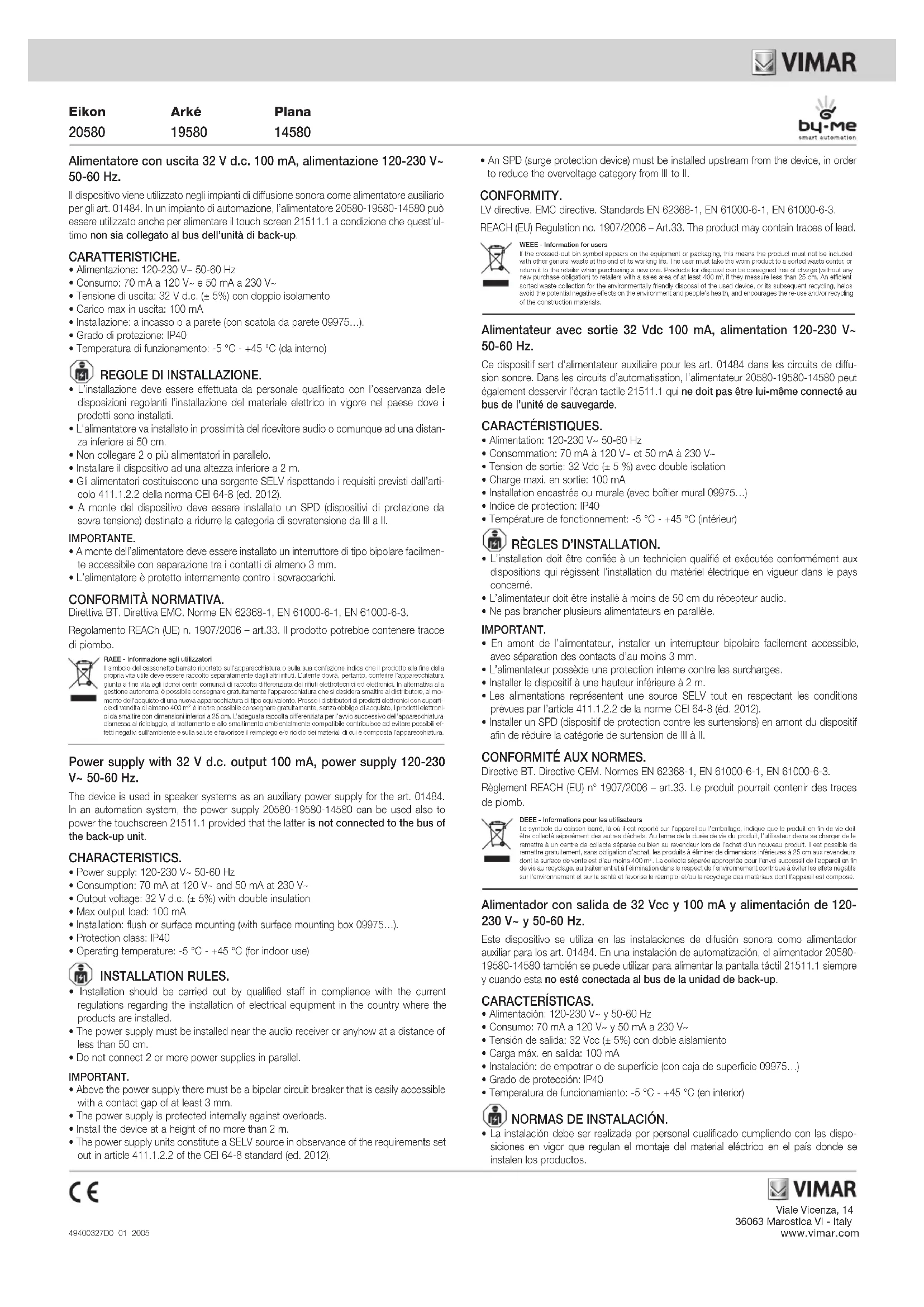 Retrouvez gratuitement la notice de l'appareil 14580.SL Vimar au format PDF.