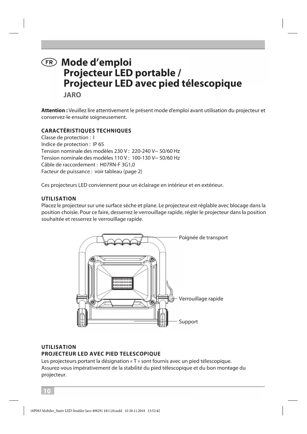 The declaration of conformity is stored at the manufacturer’s. Addresses Hugo Brennenstuhl GmbH & Co. KG Seestraße 1 – 3 · D - 72074 Tübingen H. Brennenstuhl S.A.S. 4 rue de Bruxelles ∙ F - 67170 Bernolsheim lectra-t ag Blegistrasse 13 · CH - 6340 Baar www.brennenstuhl.com 18P083 Mobiler_Stativ LED Strahler Jaro 498291 181120.indd 9 20.11.2018 13:52:4110 Verrouillage rapide Support Poignée de transport G Mode d’emploi Projecteur LED portable / Projecteur LED avec pied télescopique JARO Attention : Veuillez lire attentivement le présent mode d’emploi avant utilisation du projecteur et conservez-le ensuite soigneusement.