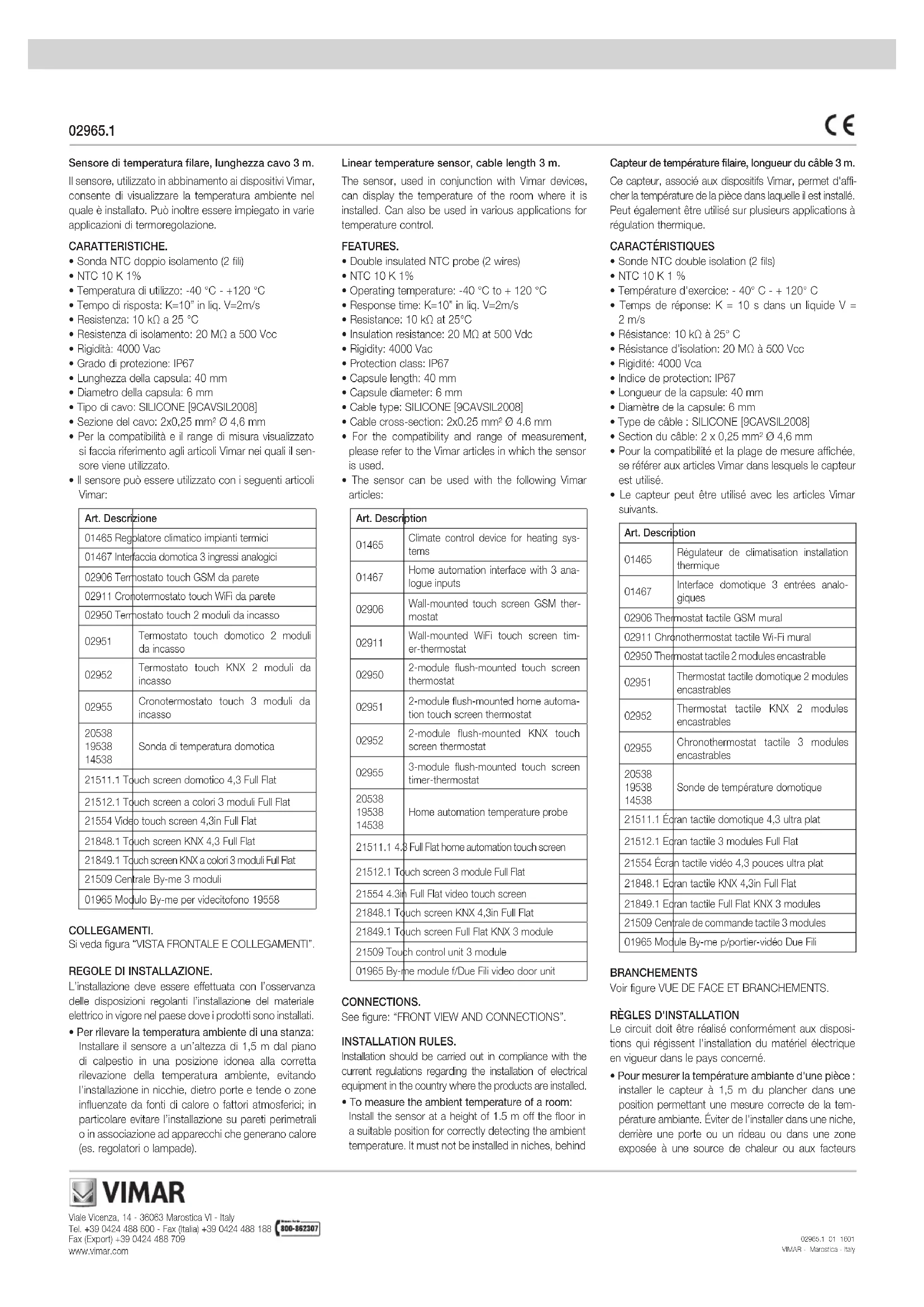- To measure the ambient temperature of a room: Install the sensor at a height of 1.5 m off the floor in a suitable position for correctly detecting the ambient temperature. It must not be installed in niches, behind Capteur de température filaire, longueur du câble 3 m. Ce capteur, associé aux dispositifs Vimar, permet d'affi- cher la température de la pièce dans laquelle il est installé. Peut également être utilisé sur plusieurs applications à régulation thermique. CARACTÉRISTIQUES