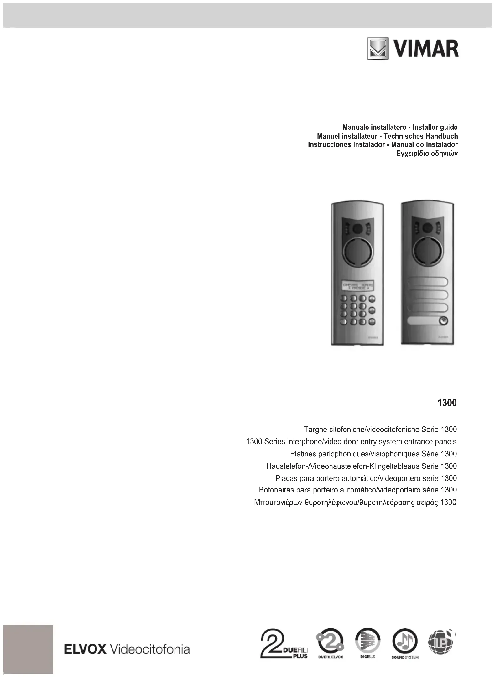 - Plaque en extrudé d’aluminium, épaisseur 18/10. - Degré de protection IP44 - Chants en technopolymère antichoc, résistant aux rayons UV. - Support pour les touches en polycarbonate antichoc transparent - Châssis en un unique bloc embouti de tôle 12/10 pré- peinte blanche. - Touches en polycarbonate transparent recouvertes avec une protection en acier inox. Les éléments de la série 1300 permettent de compo- ser des plaques pour circuits portiers et portiers-vi- déo avec technologie : - Due Fili Elvox - Digibus - Appel Sound System ou c.a. Les plaques sont dotées d’une platine frontale et d’un châssis et doivent être complétées avec l’électronique et les composants supplémentaires correspondants four- nis à part, à choisir en fonction du type de circuit (Due Fili Elvox, Digibus, Sound System, appel c.a.) et du type d’installation. La consigne concerne uniquement le montage de la plaque. Pour l’installation complète, la connexion et la program- mation (pour plaques électroniques), faire référence au manuel de l’unité électronique, de la caméra ou du poste externe à insérer : Pour système DUE FILI : - Unité électronique à boutons : 13F3 (audio), 13F5 (vidéo) - Unité électronique avec clavier alphanumérique : 13F4 (audio), 13F7 (vidéo) - Poste externe audio : 6931. Pour système DIGIBUS : - Unité électronique à boutons : 1283 (audio), 1285 (vidéo) - Unité électronique avec clavier alphanumérique : - Insert the microphone into the seat over the frame (B) closing the cap, as shown in fig. 7 detail 1. - Secure the push-buttons (G) to the frame (B) as shown in fig. 20, 21, 22, 23 - Secure the card for LED lighting (H) in its seat as shown in fig. 20, 21, 22, 23 - Secure the rainproof cover (O) to the flush-mounting box - Secure the frame to the flush-mounting box or to the rainproof cover - For audio door entry systems, on the back of the front plate you need to take out the lens ring “E” and insert the cover for closing the lens “D” (see fig. 6) - For audio/video plates art. 1321, 1331, to increase the number of external keys, take out the blanking modules and the keys, in sequence from the bottom upwards (see fig. 5), and then insert the external keys R131, in reverse order, from the top downwards. For supplementary plates art. 1358, 1372, to decrease the number of external keys, follow the same procedure using the blanking modules art. R130 - Connect the speech unit or the camera, push-buttons and LED card to the system, following the wiring diagrams in the reference manual depending on the type of system. - Close the entrance panel, securing it to the frame with the aid of a screwdriver (see fig. 8). Installing surface-mounting entrance panels on a wall - Install the surface-mounting back box (P) on the wall at a height of approx. 1.65m from the top edge of the box to the ground. Note: The 1300 series panels can be expanded only horizontally with supplementary entrance panels. - In the case of audio door entry systems: secure the bracket (C) at the top of the frame (B) with the screws in the ready-made holes and secure the speech unit to the bracket (see fig. 24) - In the case of video door entry systems: secure the camera (M) to the frame (B) as shown in fig. 1, 25. - Insert the microphone into the seat over the frame (B) closing the cap, as shown in fig. 7 detail 1. - Secure the frame to the surface-mounting back box - Secure the card for LED lighting (H) in its seat as shown in fig. 24, 25 - For entrance panels with only an audio speech unit, on the back of the front plate you need to take out the lens ring “E” and insert the cover for closing the lens “D” (see fig. 6) - For audio/video plates art. 1321, 1331, to increase the number of external keys, take out the blanking modules and the keys, in sequence from the bottom upwards (see fig. 5), and then insert the external keys R131, in reverse order, from the top downwards. For supplementary plates art. 1358, 1372, to decrease the number of external keys, follow the same procedure using the blanking modules art. R130 - Connect the speech unit or the camera, push-buttons and LED card to the system, following the wiring diagrams in the reference manual depending on the type of system. - Close the entrance panel, securing it to the frame with the aid of a screwdriver (see fig. 8) Français FREN Télécharger le manuel d’instructions sur le site www.vimar.com Règles d’installation L’installation doit etre conee a des personnel qualies et executee conformement aux dispositions qui regissent l’installation du materiel electrique en vigueur dans le pays concerne. Conformité aux normes Directive EMCNormes EN 60065, EN 61000-6-1 et EN 61000-6-3. DEEE - Informations pour les utilisateurs Le symbole du caisson barré, là où il est reporté sur l’appareil ou l’emballage, indique que le produit en n de vie doit être collecté séparément des autres déchets. Au terme de la durée de vie du produit, l’utilisateur devra se charger de le remettre à un centre de collecte séparée ou bien au revendeur lors de l’achat d’un nouveau produit. Il est possible de remettre gratuitement, sans obligation d’achat, les produits à éliminer de dimensions inférieures à 25 cm aux revendeurs dont la surface de vente est d’au moins 400 m . La collecte séparée appropriée pour l’envoi successif de l’appareil en n de vie au recyclage, au traitement et à l’élimination dans le respect de l’environnement contribue à éviter les effets négatifs sur l’environnement et sur la santé et favorise le réemploi et/ou le recyclage des matériaux dont l’appareil est composé.