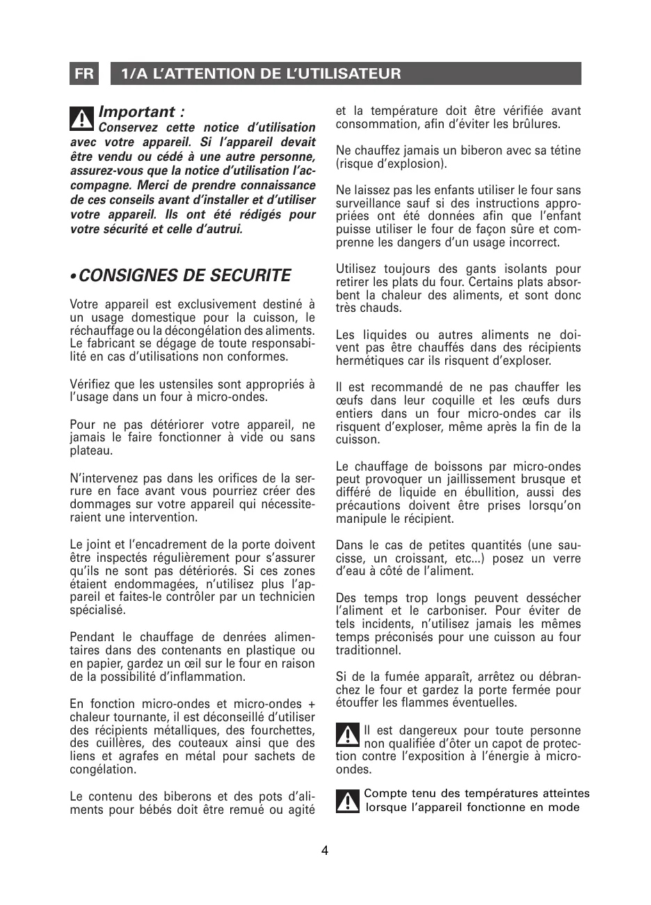 1/A L’ATTENTION DE L’UTILISATEUR et la température doit être vérifiée avant consommation, afin d’éviter les brûlures.